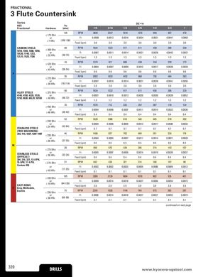 FRACTIONAL 3 Flute Countersink Series DC • in 603 Vc Fractional Hardness (sfm) 1/8 3/16 1/4 3/8 1/2 3/4 1 125 RPM 3820 2547 1910 1273 955 637 478 ≤ 175 Bhn or Fr 0.0008 0.0012 0.0016 0.0024 0.0031 0.0047 0.0063 ≤ 7 HRc (100-150) Feed (ipm) 3.0 3.0 3.0 3.0 3.0 3.0 3.0 CARBON STEELS1018, 1040, 1080, 1090,10L50, 1140, 1212,12L15, 1525, 1536≤ 300 Bhnor≤ 32 HRc60(48-72)RPMFrFeed (ipm)18340.00071.312220.00111.39170.00141.36110.00211.34580.00281.33060.00431.32290.00571.3 ≤ 425 Bhn 45 RPM 1375 917 688 458 344 229 172 or Fr 0.0004 0.0007 0.0009 0.0013 0.0017 0.0026 0.0035 ≤ 45 HRc (36-54) Feed (ipm) 0.6 0.6 0.6 0.6 0.6 0.6 0.6 P 95 RPM 2903 1935 1452 968 726 484 363 ≤ 275 Bhn or Fr 0.0007 0.0010 0.0014 0.0021 0.0028 0.0041 0.0055 ≤ 28 HRc (76-114) Feed (ipm) 2.0 2.0 2.0 2.0 2.0 2.0 2.0 ALLOY STEELS ≤ 375 Bhn 60 RPM 1834 1222 917 611 458 306 229 4140, 4150, 4320, 5120, or Fr 0.0007 0.0010 0.0013 0.0020 0.0026 0.0039 0.0052 5150, 8630, 86L20, 50100 ≤ 40 HRc (48-72) Feed (ipm) 1.2 1.2 1.2 1.2 1.2 1.2 1.2 35 RPM 1070 713 535 357 267 178 134 ≤ 450 Bhn or Fr 0.0004 0.0006 0.0007 0.0011 0.0015 0.0022 0.0030 ≤ 48 HRc (28-42) Feed (ipm) 0.4 0.4 0.4 0.4 0.4 0.4 0.4 ≤ 250 Bhn 53 RPM 1620 1080 810 540 405 270 202 or Fr 0.0004 0.0006 0.0009 0.0013 0.0017 0.0026 0.0035 STAINLESS STEELS ≤ 24 HRc (42-64) Feed (ipm) 0.7 0.7 0.7 0.7 0.7 0.7 0.7 (FREE MACHINING) 303, 416, 420F, 430F 440F ≤ 330 Bhn 46 RPM 1406 937 703 469 351 234 176 or Fr 0.0004 0.0005 0.0007 0.0011 0.0014 0.0021 0.0028 ≤ 36 HRc (37-55) Feed (ipm) 0.5 0.5 0.5 0.5 0.5 0.5 0.5 M 28 RPM 856 570 428 285 214 143 107 ≤ 275 Bhn STAINLESS STEELS(DIFFICULT) or Fr 0.0005≤ 28 HRc(22-34)Feed (ipm)0.40.00070.40.00090.40.00140.40.00190.40.00280.40.00370.4 304, 316, 321, 13-8 PH, 15-5PH, 17-4 PH, ≤ 375 Bhn 21 RPM 642 428 321 214 160 107 80 Custom 450 or Fr 0.0002 0.0002 0.0003 0.0005 0.0006 0.0009 0.0012 ≤ 40 HRc (17-25) Feed (ipm) 0.1 0.1 0.1 0.1 0.1 0.1 0.1 105 RPM 3209 2139 1604 1070 802 535 401 ≤ 220 Bhn or Fr 0.0009 0.0014 0.0018 0.0027 0.0036 0.0054 0.0072 CAST IRONS ≤ 19 HRc (84-126) Feed (ipm) 2.9 2.9 2.9 2.9 2.9 2.9 2.9 K Gray, Malleable, Ductile 75 RPM 2292 1528 1146 764 573 382 287≤ 330 Bhn or Fr 0.0009 0.0014 0.0018 0.0027 0.0037 0.0055 0.0073 ≤ 36 HRc (60-90) Feed (ipm) 2.1 2.1 2.1 2.1 2.1 2.1 2.1 continued on next page 320 DRILLS www.kDyRoIcLeLrSa-sgstool.com