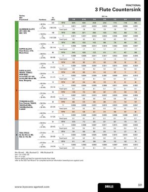 FRACTIONAL 3 Flute Countersink Series DC • in 603 Vc Fractional Hardness (sfm) 1/8 3/16 1/4 3/8 1/2 3/4 1 225 RPM 6876 4584 3438 2292 1719 1146 860 ≤ 80 Bhn or Fr 0.0011 0.0017 0.0023 0.0034 0.0045 0.0068 0.0091 ALUMINUM ALLOYS ≤ 47 HRb (180-270) Feed (ipm) 7.8 7.8 7.8 7.8 7.8 7.8 7.8 2017, 2024, 356, 6061, 7075 190 RPM 5806 3871 2903 1935 1452 968 726≤ 150 Bhn or Fr 0.0011 0.0017 0.0022 0.0034 0.0045 0.0067 0.0090 ≤ 7 HRc (152-228) Feed (ipm) 6.5 6.5 6.5 6.5 6.5 6.5 6.5 N 95 RPM 2903 1935 1452 968 726 484 363 ≤ 140 Bhn or Fr 0.0006 0.0009 0.0012 0.0018 0.0023 0.0035 0.0047 COPPER ALLOYS ≤ 3 HRc (76-114) Feed (ipm) 1.7 1.7 1.7 1.7 1.7 1.7 1.7 Alum Bronze, C110, Muntz Brass 80 RPM 2445 1630 1222 815 611 407 306≤ 200 Bhn or Fr 0.0006 0.0009 0.0011 0.0017 0.0023 0.0034 0.0046 ≤ 23 HRc (64-96) Feed (ipm) 1.4 1.4 1.4 1.4 1.4 1.4 1.4 18 RPM 550 367 275 183 138 92 69 ≤ 220 Bhn or Fr 0.0004 0.0005 0.0007 0.0011 0.0015 0.0022 0.0029 ≤ 19 HRc (14-22) Feed (ipm) 0.2 0.2 0.2 0.2 0.2 0.2 0.2 SUPER ALLOYS (NICKEL, COBALT,IRON BASE)Inconel 601, 617, 625,Incoloy 800, Monel 400,≤ 320 Bhnor≤ 34 HRc14RPMFr(11-17)Feed (ipm)4280.00020.12850.00040.12140.00050.11430.00070.11070.00090.1710.00140.1530.00190.1 Rene, Waspaloy 12 RPM 367 244 183 122 92 61 46 ≤ 425 Bhn or Fr 0.0003 0.0004 0.0005 0.0008 0.0011 0.0016 0.0022 ≤ 45 HRc (10-14) Feed (ipm) 0.1 0.1 0.1 0.1 0.1 0.1 0.1 S 36 RPM 1100 733 550 367 275 183 138 ≤ 275 Bhn or Fr 0.0007 0.0011 0.0015 0.0022 0.0029 0.0044 0.0058 ≤ 28 HRc (29-43) Feed (ipm) 0.8 0.8 0.8 0.8 0.8 0.8 0.8 TITANIUM ALLOYS 28 RPM 856 570 428 285 214 143 107 Pure Titanium, Ti6Al4V, ≤ 350 Bhn Ti6Al2Sn4Zr2Mo, or Fr 0.0006 0.0009 0.0012 0.0018 0.0023 0.0035 0.0047 Ti4Al4Mo2Sn0.5Si, ≤ 38 HRc (22-34) Ti-6Al4V Feed (ipm) 0.5 0.5 0.5 0.5 0.5 0.5 0.5 ≤ 440 Bhn 21 RPM 642 428 321 214 160 107 80 or Fr 0.0002 0.0002 0.0003 0.0005 0.0006 0.0009 0.0012 ≤ 47 HRc (17-25) Feed (ipm) 0.1 0.1 0.1 0.1 0.1 0.1 0.1 35 RPM 1070 713 535 357 267 178 134 ≤ 250 Bhn or Fr 0.0004 0.0006 0.0007 0.0011 0.0015 0.0022 0.0030 ≤ 24 HRc (28-42) Feed (ipm) 0.4 0.4 0.4 0.4 0.4 0.4 0.4 TOOL STEELS ≤ 375 Bhn 25 RPM 764 509 382 255 191 127 96 H A2, D2, H13, L2, M2, or Fr 0.0003 0.0004 0.0005 0.0008 0.0010 0.0016 0.0021 P20, S7, T15, W2 ≤ 40 HRc (20-30) Feed (ipm) 0.2 0.2 0.2 0.2 0.2 0.2 0.2 20 RPM 611 407 306 204 153 102 76 ≤ 475 Bhn or Fr 0.0002 0.0002 0.0003 0.0005 0.0007 0.0010 0.0013 ≤ 50 HRc (16-24) Feed (ipm) 0.1 0.1 0.1 0.1 0.1 0.1 0.1 Bhn (Brinell) HRc (Rockwell C) HRb (Rockwell B) rpm = Vc x 3.82 / DC ipm = Fr x rpm reduce speed and feed for materials harder than listed refer to the SGS Tool Wizard® for complete technical information (www.kyocera-sgstool.com) www.kyoceraD-sRgILsLtoSol.com DRILLS 321