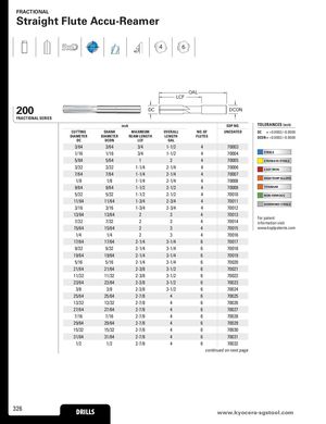 FRACTIONAL Straight Flute Accu-Reamer 4 6 45° OAL LCF 200 DC DCON FRACTIONAL SERIES inch EDP NO. TOLERANCES (inch) CUTTING SHANK MAXIMUM OVERALL NO. OF UNCOATED DC = +0.0002/–0.0000 DIAMETER DIAMETER REAM LENGTH LENGTH FLUTES DCON = +0.0002/–0.0000 DC DCON LCF OAL 3/64 3/64 3/4 1-1/2 4 70003 1/16 1/16 3/4 1-1/2 4 70004 STEELS 5/64 5/64 1 2 4 70005 STAINLESS STEELS 3/32 3/32 1-1/4 2-1/4 4 70006 CAST IRON 7/64 7/64 1-1/4 2-1/4 4 70007 1/8 1/8 1-1/4 2-1/4 4 70008 HIGH TEMP ALLOYS 9/64 9/64 1-1/2 2-1/2 4 70009 TITANIUM 5/32 5/32 1-1/2 2-1/2 4 70010 NON-FERROUS 11/64 11/64 1-3/4 2-3/4 4 70011 HARDENED STEELS 3/16 3/16 1-3/4 2-3/4 4 70012 13/64 13/64 2 3 4 70013 For patent 7/32 7/32 2 3 4 70014 information visit 15/64 15/64 2 3 4 70015 www.ksptpatents.com 1/4 1/4 2 3 4 70016 17/64 17/64 2-1/4 3-1/4 6 70017 9/32 9/32 2-1/4 3-1/4 6 70018 19/64 19/64 2-1/4 3-1/4 6 70019 5/16 5/16 2-1/4 3-1/4 6 70020 21/64 21/64 2-3/8 3-1/2 6 70021 11/32 11/32 2-3/8 3-1/2 6 70022 23/64 23/64 2-3/8 3-1/2 6 70023 3/8 3/8 2-3/8 3-1/2 6 70024 25/64 25/64 2-7/8 4 6 70025 13/32 13/32 2-7/8 4 6 70026 27/64 27/64 2-7/8 4 6 70027 7/16 7/16 2-7/8 4 6 70028 29/64 29/64 2-7/8 4 6 70029 15/32 15/32 2-7/8 4 6 70030 31/64 31/64 2-7/8 4 6 70031 1/2 1/2 2-7/8 4 6 70032 continued on next page 326 DRILLS www.kDyRoIcLeLrSa-sgstool.com