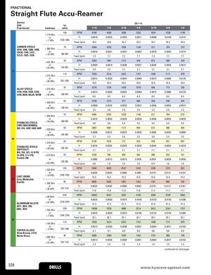 FRACTIONAL Straight Flute Accu-Reamer Series DC • in 200 Vc Fractional Hardness (sfm) 1/16 1/8 3/16 1/4 5/16 3/8 1/2 150 RPM 9168 4584 3056 2292 1834 1528 1146 ≤ 175 Bhn or Fr 0.0018 0.0035 0.0053 0.0071 0.0088 0.0106 0.0141 ≤ 7 HRc (120-180) Feed (ipm) 16.5 16.0 16.2 16.3 16.1 16.2 16.2 CARBON STEELS1018, 1040, 1080, 1090,≤ 300 Bhn75 RPM 4584 2292 1528 1146 917 764 573 10L50, 1140, 1212,12L15, 1525, 1536or Fr 0.0016 0.0031 0.0047 0.0062 0.0078 0.0093 0.0124≤ 32 HRc(60-90)Feed (ipm)7.37.17.27.17.27.17.1 ≤ 425 Bhn 55 RPM 3362 1681 1121 840 672 560 420 or Fr 0.0009 0.0019 0.0028 0.0037 0.0046 0.0056 0.0074 P ≤ 45 HRc (44-66) Feed (ipm) 3.0 3.2 3.1 3.1 3.1 3.1 3.1 ≤ 275 Bhn 115 RPM 7029 3514 2343 1757 1406 1171 879 or Fr 0.0015 0.0030 0.0045 0.0060 0.0075 0.0090 0.0120 ≤ 28 HRc (92-138) Feed (ipm) 10.5 10.5 10.5 10.5 10.5 10.5 10.5 ALLOY STEELS ≤ 375 Bhn 70 RPM 4278 2139 1426 1070 856 713 535 4140, 4150, 4320, 5120, or Fr 0.0015 0.0030 0.0045 0.0060 0.0075 0.0090 0.0120 5150, 8630, 86L20, 50100 ≤ 40 HRc (56-84) Feed (ipm) 6.4 6.4 6.4 6.4 6.4 6.4 6.4 ≤ 450 Bhn 45 RPM 2750 1375 917 688 550 458 344 or Fr 0.0009 0.0019 0.0028 0.0037 0.0046 0.0056 0.0074 ≤ 48 HRc (36-54) Feed (ipm) 2.5 2.6 2.6 2.5 2.5 2.6 2.5 ≤ 250 Bhn 75 RPM 4584 2292 1528 1146 917 764 573 or Fr 0.0010 0.0020 0.0029 0.0039 0.0049 0.0059 0.0078 STAINLESS STEELS ≤ 24 HRc (60-90) Feed (ipm) 4.6 4.6 4.4 4.5 4.5 4.5 4.5 (FREE MACHINING) 303, 416, 420F, 430F 440F ≤ 330 Bhn 55 RPM 3362 1681 1121 840 672 560 420 or Fr 0.0008 0.0015 0.0023 0.0030 0.0038 0.0045 0.0060 ≤ 36 HRc (44-66) Feed (ipm) 2.7 2.5 2.6 2.5 2.6 2.5 2.5 M ≤ 275 Bhn 35 RPM 2139 1070 713 535 428 357 267 STAINLESS STEELS(DIFFICULT) or Fr 0.0010≤ 28 HRc(28-42)Feed (ipm)2.10.00202.10.00292.10.00392.10.00492.10.00592.10.00782.1 304, 316, 321, 13-8 PH, 15-5PH, 17-4 PH, ≤ 375 Bhn 25 RPM 1528 764 509 382 306 255 191 Custom 450 or Fr 0.0006 0.0013 0.0019 0.0025 0.0031 0.0038 0.0050 ≤ 40 HRc (20-30) Feed (ipm) 0.9 1.0 1.0 1.0 0.9 1.0 1.0 ≤ 220 Bhn 125 RPM 7640 3820 2547 1910 1528 1273 955 or Fr 0.0020 0.0040 0.0060 0.0081 0.0101 0.0121 0.0161 CAST IRONS ≤ 19 HRc (100-150) Feed (ipm) 15.3 15.3 15.3 15.5 15.4 15.4 15.4 K Gray, Malleable, Ductile ≤ 330 Bhn 95 RPM 5806 2903 1935 1452 1161 968 726 or Fr 0.0020 0.0040 0.0060 0.0081 0.0101 0.0121 0.0161 ≤ 36 HRc (76-114) Feed (ipm) 11.6 11.6 11.6 11.8 11.7 11.7 11.7 ≤ 80 Bhn 270 RPM 16502 8251 5501 4126 3300 2750 2063 or Fr 0.0025 0.0050 0.0075 0.0100 0.0125 0.0150 0.0200 ALUMINUM ALLOYS ≤ 47 HRb (216-324) Feed (ipm) 41.3 41.3 41.3 41.3 41.3 41.3 41.3 2017, 2024, 356, 6061, 7075 ≤ 150 Bhn 230 RPM 14058 7029 4686 3514 2812 2343 1757 or Fr 0.0025 0.0050 0.0075 0.0100 0.0125 0.0150 0.0200 ≤ 7 HRc (184-276) Feed (ipm) 35.1 35.1 35.1 35.1 35.1 35.1 35.1 N ≤ 140 Bhn 115 RPM 7029 3514 2343 1757 1406 1171 879 or Fr 0.0013 0.0026 0.0038 0.0051 0.0064 0.0077 0.0102 COPPER ALLOYS ≤ 3 HRc (92-138) Feed (ipm) 9.1 9.1 8.9 9.0 9.0 9.0 9.0 Alum Bronze, C110, Muntz Brass ≤ 200 Bhn 95 RPM 5806 2903 1935 1452 1161 968 726 or Fr 0.0013 0.0026 0.0038 0.0051 0.0064 0.0077 0.0102 ≤ 23 HRc (76-114) Feed (ipm) 7.5 7.5 7.4 7.4 7.4 7.5 7.4 continued on next page 328 DRILLS www.kDyRoIcLeLrSa-sgstool.com