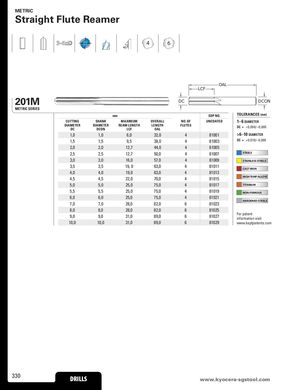 METRIC Straight Flute Reamer 4 6 45° OAL LCF 201M DC DCON METRIC SERIES mm EDP NO. TOLERANCES (mm) CUTTING SHANK MAXIMUM OVERALL NO. OF UNCOATED 1–6 DIAMETER DIAMETER DIAMETER REAM LENGTH LENGTH FLUTESDCDCONLCFOAL DC = +0,008/–0,000 1,0 1,0 6,0 32,0 4 81001 >6–10 DIAMETER 1,5 1,5 9,5 38,0 4 81003 DC = + 0, 010 / – 0, 0 0 0 2,0 2,0 12,7 44,0 4 81005 2,5 2,5 12,7 50,0 4 81007 STEELS 3,0 3,0 16,0 57,0 4 81009 STAINLESS STEELS 3,5 3,5 19, 0 63,0 4 81011 CAST IRON 4,0 4,0 19,0 63,0 4 81013 4,5 4,5 22,0 70,0 4 81015 HIGH TEMP ALLOYS 5,0 5,0 25,0 75,0 4 81017 TITANIUM 5,5 5,5 25,0 75,0 4 81019 NON-FERROUS 6,0 6,0 25,0 75,0 4 81021 HARDENED STEELS 7,0 7,0 28,0 82,0 6 81023 8,0 8,0 28,0 82,0 6 81025 9,0 9,0 31,0 89,0 6 81027 For patentinformation visit 10,0 10,0 31,0 89,0 6 81029 www.ksptpatents.com 330 DRILLS www.kDyRoIcLeLrSa-sgstool.com