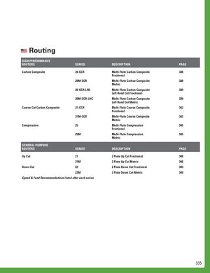 Routing HIGH PERFORMANCE ROUTERS SERIES DESCRIPTION PAGE Carbon Composite 20-CCR Multi-Flute Carbon Composite 338 Fractional 20M-CCR Multi-Flute Carbon Composite 338 Metric 20-CCR-LHC Multi-Flute Carbon Composite 339 Left Hand Cut Fractional 20M-CCR-LHC Multi-Flute Carbon Composite 339 Left Hand Cut Metric Coarse Cut Carbon Composite 31-CCR Multi-Flute Coarse Composite 342 Fractional 31M-CCR Multi-Flute Coarse Composite 342 Metric Compression 25 Multi-Flute Compression 345 Fractional 25M Multi-Flute Compression 345 Metric GENERAL PURPOSE ROUTERS SERIES DESCRIPTION PAGE Up Cut 21 2 Flute Up Cut Fractional 348 21M 2 Flute Up Cut Metric 348 Down Cut 22 2 Flute Down Cut Fractional 349 22M 2 Flute Down Cut Metric 349 Speed & Feed Recommendations listed after each series 335