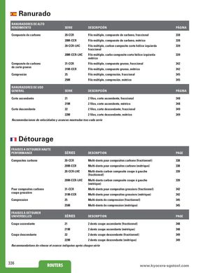 Ranurado RANURADORES DE ALTO RENDIMIENTO SERIE DESCRIPCIÓN PÁGINA Compuesto de carbono 20-CCR Filo múltiple, compuesto de carbono, fraccional 338 20M-CCR Filo múltiple, compuesto de carbono, métrico 338 20-CCR-LHC Filo múltiple, carbon composite corte hélice izquierda 339 fraccional 20M-CCR-LHC Filo múltiple, carbo composite corte hélice izquierda 339 métrico Compuesto de carbono 31-CCR Filo múltiple, compuesto grueso, fraccional 342 de corte grueso 31M-CCR Filo múltiple, compuesto grueso, métrico 342 Compresión 25 Filo múltiple, compresión, fraccional 345 25M Filo múltiple, compresión, métrico 345 RANURADORES DE USO GENERAL SERIE DESCRIPCIÓN PÁGINA Corte ascendente 21 2 filos, corte ascendente, fraccional 348 21M 2 filos, corte ascendente, métrico 348 Corte descendente 22 2 filos, corte descendente, fraccional 349 22M 2 filos, corte descendente, métrico 349 Recomendaciones de velocidades y avances mostradas tras cada serie Détourage FRAISES A DETOURER HAUTE PERFORMANCE SÈRIES DESCRIPTION PAGE Composites carbone 20-CCR Multi-dents pour composites carbone (fractionnel) 338 20M-CCR Multi-dents pour composites carbone (métrique) 338 20-CCR-LHC Multi-dents carbon composite coupe à gauche 339 (fractionnel) 20M-CCR-LHC Multi-dents carbon composite coupe à gauche 339 (métrique) Pour composites carbone 31-CCR Multi-dents pour composites grossiers (fractionnel) 342 coupe grossière 31M-CCR Multi-dents pour composites grossiers (métrique) 342 Compression 25 Multi-dents de compression (fractionnel) 345 25M Multi-dents de compression (métrique) 345 FRAISES À DÉTOURER UNIVERSELLES SÈRIES DESCRIPTION PAGE Coupe ascendante 21 2 dents coupe ascendante (fractionnel) 348 21M 2 dents coupe ascendante (métrique) 348 Coupe descendante 22 2 dents coupe descendante (fractionnel) 349 22M 2 dents coupe descendante (métrique) 349 Recommandations de vitesse et avance indiquées après chaque série 336 ROUTERS www.RkOyUocTEeRraS-sgstool.com