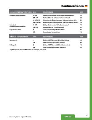 Konturenfräsen HOCHLEISTUNGS-KONTURENFRÄSER SERIE BESCHREIBUNG SEITE Kohlefaserverbundwerkstoff 20-CCR Zölliger Konturenfräser für Kohlefaserverbundwerkstoff 338 20M-CCR Konturenfräser für Kohlefaserverbundwerkstoff 338 20-CCR-LHC Mehrschneider Carbon Composite Links geschnittene zöllig 339 20M-CCR-LHC Mehrschneider Carbon Composite Links geschnittene metrisch 339 Grobschnitt 31-CCR Zölliger Konturenfräser für Verbundkunststoff 342 Kohlefaserverbundwerkstoff 31M-CCR Konturenfräser für Verbundkunststoff 342 Gegenläufiger Drall 25 Zölliger Gegenläufiger Konturenfräser 345 25M Gegenläufiger Konturenfräser 345 STANDARD-KONTURENFRÄSER SERIE BESCHREIBUNG SEITE Rechtsspirale 21 Zölliger VHM-Fräser mit 2 Schneiden (ziehend) 348 21M VHM-Fräser mit 2 Schneiden (ziehend) 348 Linksspirale 22 Zölliger VHM-Fräser mit 2 Schneiden (drückend) 349 22M VHM-Fräser mit 2 Schneiden (drückend) 349 Empfehlungen für Drehzahl & Vorschub im Anhang zu jeder Serie www.kyocerRaO-sUgTsEtRoSol.com ROUTERS 337