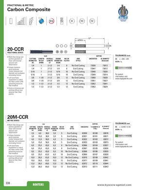 FRACTIONAL & METRIC Carbon Composite 15° POS CCR CARBON-FIBER RHC 8 10 12 COMPOSITEROUTERS LF APMX DC DCON 20-CCR FRACTIONAL SERIES • Multi-flute design and inch EDP NO. TOLERANCES (inch) positive geometry to CUTTING LENGTH OVERALL SHANK NO. OF END UNCOATED Di-NAMITE® DC = +.000/–.005 shear with minimal DIAMETER OF CUT LENGTH DIAMETER FLUTES STYLEpressure andDCAPMXLFDCON (Diamond) DCON = h6 delamination 1/4 1 2-1/2 1/4 8 No End Cutting 72930 73013 • Unique clearancegrind minimizes1/4 1 2-1/2 1/4 8 End Cutting 72947 73012 PLASTICS/COMPOSITES contact between tool 5/16 1 2-1/2 5/16 10 No End Cutting 72948 73026 diameter and workpieceeliminating friction5/16 1 2-1/2 5/16 10 End Cutting 72949 73014• Left hand flutes3/81-1/82-1/23/812No End Cutting7295073028engineered to controlthe fibers within CFRP,3/81-1/82-1/23/812End Cutting7295173027For patentinformation visitwww.ksptpatents.com preventing excessive 1/2 1-1/2 3-1/2 1/2 12 No End Cutting 72952 73041 fiber breakout 1/2 1-1/2 3-1/2 1/2 12 End Cutting 72953 73029 • Excels at trimming and profiling difficult and abrasive fiber filled plastics 20M-CCR METRIC SERIES • Multi-flute design and mm EDP NO. TOLERANCES (mm) positive geometry to CUTTING LENGTH OVERALL SHANK NO. OF END UNCOATED Ti-NAMITE-B Di-NAMITE® DC = +0,000/–0,130 shear with minimal DIAMETER OF CUT LENGTH DIAMETER FLUTES STYLEpressure andDCAPMXLFDCON (TiB2) (Diamond) DCON = h6 delamination 2,0 6,0 38,0 3,0 5 End Cutting 82930 83100 83070 • Unique clearancegrind minimizes3,0 10,0 38,0 3,0 5 End Cutting 82931 83101 83071 PLASTICS/COMPOSITES contact between tool 4,0 12,0 50,0 4,0 5 End Cutting 82932 83102 83072 diameter and workpieceeliminating friction• Left hand flutesengineered to controlthe fibers within CFRP,5,015,050,06,05End Cutting8293383103 830736,025,063,06,08No End Cutting8296683104830276,025,063,06,08End Cutting829678310583026For patentinformation visitwww.ksptpatents.com preventing excessive 8,0 25,0 63,0 8,0 10 No End Cutting 82968 83106 83029 fiber breakout 8,0 25,0 63,0 8,0 10 End Cutting 82969 83107 83028 • Excels at trimming andprofiling difficult and10,028,0 63,0 10,0 12 No End Cutting 82970 83108 83042 abrasive fiber filled 10,0 28,0 63,0 10,0 12 End Cutting 82971 83109 83041 plastics 12,0 38,0 89,0 12,0 12 No End Cutting 82972 83110 83044 12,0 38,0 89,0 12,0 12 End Cutting 82973 83111 83043 338 ROUTERS www.RkOyUocTEeRraS-sgstool.com
