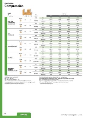 FRACTIONAL Compression Ap Series Ae Ae DC • in 25 Vc Fractional Ae x DC Ap x DC (sfm) 1/4 5/16 3/8 1/2 Profile 500 RPM 7640 6112 5093 3820 ≤ 0.5 ≤ 1.5 Fz 0.0016 0.0030 0.0040 0.0048 CFRP, AFRP (400-600) Feed (ipm) 49 73 122 147 (CARBON FIBER, ARAMID FIBER) HSM 825 RPM 12606 10085 8404 6303 ≤ 0.05 ≤2 Fz 0.0037 0.0069 0.0092 0.0110 (660-990) Feed (ipm) 187 278 464 555 Profile 400 RPM 6112 4890 4075 3056 ≤ 0.5 ≤ 1.5 Fz 0.0016 0.0030 0.0040 0.0048 (320-480) GFRP Feed (ipm) 39 59 98 117 (FIBERGLASS) HSM 660 RPM 10085 8068 6723 5042 ≤ 0.05 ≤2 Fz 0.0037 0.0069 0.0092 0.0110 (528-792) Feed (ipm) 149 223 371 444 Profile 600 RPM 9168 7334 6112 4584 ≤ 0.5 ≤ 1.5 Fz 0.0020 0.0038 0.0050 0.0060 (480-720) Feed (ipm) 73 111 183 220 N CARBON, GRAPHITE HSM 990 RPM 15127 12102 10085 7564 ≤ 0.05 ≤2 Fz 0.0046 0.0086 0.0115 0.0138 (792-1188) Feed (ipm) 278 416 696 835 Profile 1000 RPM 15280 12224 10187 7640 ≤ 0.5 ≤ 1.5 Fz 0.0020 0.0038 0.0050 0.0060 (800-1200) Feed (ipm) 122 186 306 367 PLASTICS HSM 1650 RPM 25212 20170 16808 12606 ≤ 0.05 ≤2 Fz 0.0046 0.0086 0.0115 0.0138 (1320-1980) Feed (ipm) 464 694 1160 1392 Profile 50 RPM 764 611 509 382 ≤ 0.5 ≤ 1.5 Fz 0.0008 0.0015 0.0020 0.0024 MACHINABLE (40-60) Feed (ipm) 2.4 3.7 6.1 7.3 CERAMICS MACHINABLE GLASS HSM 85 RPM 1299 1039 866 649 ≤ 0.05 ≤2 Fz 0.0018 0.0034 0.0046 0.0055 (68-102) Feed (ipm) 9.4 14.1 23.9 28.6 HSM (high speed machining) finish cuts typically required reduced feed and cutting depths rpm = Vc x 3.82 / DC rates shown are for use without coolant; rates may be increased with coolant ipm = Fz x number of flutes x rpm dust collection is vital when machining dry adjust parameters based on resin type and fiber structure diamond coating will increase tool life in graphite and composite materials reduce speed when overheating causes melting or damage to resin refer to the SGS Tool Wizard® for complete technical information reduce feed if delamination or fraying occur (www.kyocera-sgstool.com) 346 ROUTERS www.RkOyUocTEeRraS-sgstool.com