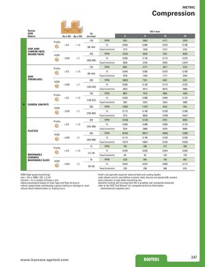 METRIC Compression Ap Series Ae Ae DC • mm 25M Vc Metric Ae x DC Ap x DC (m/min) 6 8 10 12 Profile 150 RPM 7951 5963 4771 3976 ≤ 0.5 ≤ 1.5 Fz 0.040 0.065 0.075 0.100 CFRP, AFRP (96-164) Feed (mm/min) 1272 1550 2147 3181 (CARBON FIBER, ARAMID FIBER) HSM 250 RPM 13252 9939 7951 6626 ≤ 0.05 ≤2 Fz 0.095 0.145 0.175 0.235 (200-300) Feed (mm/min) 5036 5765 8349 12457 Profile 120 RPM 6361 4771 3817 3181 ≤ 0.5 ≤ 1.5 Fz 0.040 0.065 0.075 0.100 (96-164) GFRP Feed (mm/min) 1018 1240 1717 2544 (FIBERGLASS) HSM 200 RPM 10602 7951 6361 5301 ≤ 0.05 ≤2 Fz 0.095 0.145 0.175 0.235 (160-240) Feed (mm/min) 4029 4612 6679 9966 Profile 185 RPM 9807 7355 5884 4903 ≤ 0.5 ≤ 1.5 Fz 0.050 0.080 0.095 0.125 (148-222) Feed (mm/min) 1961 2354 3354 4903 N CARBON, GRAPHITE HSM 300 RPM 15903 11927 9542 7951 ≤ 0.05 ≤2 Fz 0.115 0.185 0.220 0.290 (240-360) Feed (mm/min) 7315 8826 12595 18447 Profile 305 RPM 16168 12126 9701 8084 ≤ 0.5 ≤ 1.5 Fz 0.050 0.080 0.095 0.125 (244-366) Feed (mm/min) 3234 3880 5529 8084 PLASTICS HSM 505 RPM 26769 20077 16062 13385 ≤ 0.05 ≤2 Fz 0.115 0.185 0.220 0.290 (404-606) Feed (mm/min) 12314 14857 21201 31052 Profile 15 RPM 795 596 477 398 ≤ 0.5 ≤ 1.5 Fz 0.020 0.035 0.045 0.050 MACHINABLE (12-18) Feed (mm/min) 64 83 129 159 CERAMICS MACHINABLE GLASS HSM 25 RPM 1325 994 795 663 ≤ 0.05 ≤2 Fz 0.045 0.075 0.085 0.115 (20-30) Feed (mm/min) 239 298 406 610 HSM (high speed machining) finish cuts typically required reduced feed and cutting depths rpm = (Vc x 1000) / (DC x 3.14) rates shown are for use without coolant; rates may be increased with coolant mm/min = Fz x number of flutes x rpm dust collection is vital when machining dry adjust parameters based on resin type and fiber structure diamond coating will increase tool life in graphite and composite materials reduce speed when overheating causes melting or damage to resin refer to the SGS Tool Wizard® for complete technical information reduce feed if delamination or fraying occur (www.kyocera-sgstool.com) www.kyocerRaO-sUgTsEtRoSol.com ROUTERS 347