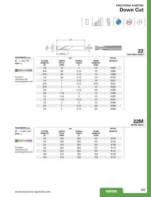 FRACTIONAL & METRIC Down Cut 35° POS RHC 2 LF DC DCON 22 APMX FRACTIONAL SERIES TOLERANCES (inch) inch EDP NO. DC = +.000/–.003 CUTTING LENGTH OVERALL SHANK UNCOATED DCON = h6 DIAMETER OF CUT LENGTH DIAMETERDCAPMXLFDCON 1/8 1/2 2 1/4 91001 PLASTICS/COMPOSITES 5/32 5/8 2-1/2 1/4 91005 3/16 3/4 2-1/2 1/4 91009 For patent 1/4 3/4 2-1/2 1/4 91013 information visitwww.ksptpatents.com1/4 1 2-1/2 1/4 91017 5/16 1 2-1/2 5/16 91021 5/16 1 3 1/2 91025 3/8 1 2-1/2 3/8 91029 3/8 1-1/4 3 1/2 91033 1/2 1-1/4 3 1/2 91037 1/2 1-1/2 3-1/2 1/2 91041 1/2 2 4 1/2 91045 5/8 2 4-1/2 5/8 91049 3/4 2 4-1/2 3/4 91053 22M METRIC SERIES TOLERANCES (mm) mm EDP NO. DC = +0,000/–0,080 CUTTING LENGTH OVERALL SHANK UNCOATED DCON = h6 DIAMETER OF CUT LENGTH DIAMETERDCAPMXLFDCON 3,0 13,0 50,0 6,0 91101 PLASTICS/COMPOSITES 4,0 16,0 63,0 6,0 91107 5,0 19,0 63,0 6,0 91109 For patent 6,0 25,0 63,0 6,0 91113 information visitwww.ksptpatents.com8,0 25,0 63,0 8,0 91121 10,0 31,0 75,0 10,0 91129 12,0 31,0 75,0 12,0 91137 www.kyocerRaO-sUgTsEtRoSol.com ROUTERS 349