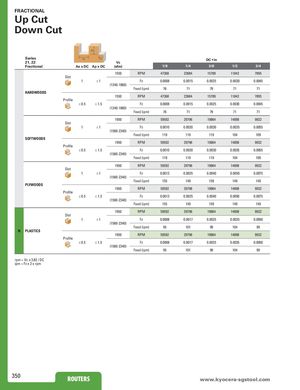 FRACTIONAL Up Cut Down Cut Ap Series Ae Ae DC • in 21, 22 Vc Fractional Ae x DC Ap x DC (sfm) 1/8 1/4 3/8 1/2 3/4 1550 RPM 47368 23684 15789 11842 7895 Slot 1 ≤1 Fz 0.0008 0.0015 0.0025 0.0030 0.0045 (1240-1860) Feed (ipm) 76 71 79 71 71 HARDWOODS 1550 RPM 47368 23684 15789 11842 7895 Profile ≤ 0.5 ≤ 1.5 Fz 0.0008 0.0015 0.0025 0.0030 0.0045 (1240-1860) Feed (ipm) 76 71 79 71 71 1950 RPM 59592 29796 19864 14898 9932 Slot 1 ≤1 Fz 0.0010 0.0020 0.0030 0.0035 0.0055 (1560-2340) Feed (ipm) 119 119 119 104 109 SOFTWOODS 1950 RPM 59592 29796 19864 14898 9932 Profile ≤ 0.5 ≤ 1.5 Fz 0.0010 0.0020 0.0030 0.0035 0.0055 (1560-2340) Feed (ipm) 119 119 119 104 109 1950 RPM 59592 29796 19864 14898 9932 Slot 1 ≤1 Fz 0.0013 0.0025 0.0040 0.0050 0.0075 (1560-2340) Feed (ipm) 155 149 159 149 149 PLYWOODS 1950 RPM 59592 29796 19864 14898 9932 Profile ≤ 0.5 ≤ 1.5 Fz 0.0013 0.0025 0.0040 0.0050 0.0075 (1560-2340) Feed (ipm) 155 149 159 149 149 1950 RPM 59592 29796 19864 14898 9932 Slot 1 ≤1 Fz 0.0008 0.0017 0.0025 0.0035 0.0050 (1560-2340) Feed (ipm) 95 101 99 104 99 N PLASTICS 1950 RPM 59592 29796 19864 14898 9932 Profile ≤ 0.5 ≤ 1.5 Fz 0.0008 0.0017 0.0025 0.0035 0.0050 (1560-2340) Feed (ipm) 95 101 99 104 99 rpm = Vc x 3.82 / DC ipm = Fz x 2 x rpm 350 ROUTERS www.RkOyUocTEeRraS-sgstool.com