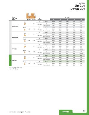 METRIC Up Cut Down Cut Ap Series Ae Ae DC • mm 21M, 22M Vc Metric Ae x DC Ap x DC (m/min) 3 6 10 12 20 Slot 470 RPM 49828 24914 14948 12457 7474 1 ≤1 Fz 0.020 0.040 0.065 0.075 0.115 (376-564) Feed (mm/min) 1993 1993 1943 1869 1719 HARDWOODS Profile 470 RPM 49828 24914 8155 4241 1509 ≤ 0.5 ≤ 1.5 Fz 0.020 0.040 0.065 0.075 0.115 (376-564) Feed (mm/min) 1993 1993 1060 636 347 Slot 600 RPM 63610 31805 19083 15903 9542 1 ≤1 Fz 0.025 0.050 0.075 0.090 0.140 (480-720) Feed (mm/min) 3181 3181 2862 2862 2672 SOFTWOODS Profile 600 RPM 63610 31805 19083 15903 303467 ≤ 0.5 ≤ 1.5 Fz 0.025 0.050 0.075 0.090 0.140 (480-720) Feed (mm/min) 3181 3181 2862 2862 84971 Slot 600 RPM 63610 31805 19083 15903 9542 1 ≤1 Fz 0.030 0.065 0.100 0.125 0.190 (480-720) Feed (mm/min) 3817 4135 3817 3976 3626 PLYWOODS Profile 600 RPM 63610 31805 19083 15903 303467 ≤ 0.5 ≤ 1.5 Fz 0.030 0.065 0.100 0.125 0.190 (480-720) Feed (mm/min) 3817 4135 3817 3976 115318 Slot 600 RPM 63610 31805 19083 15903 9542 1 ≤1 Fz 0.020 0.040 0.065 0.090 0.125 (480-720) Feed (mm/min) 2544 2544 2481 2862 2385 N PLASTICS Profile 600 RPM 63610 31805 19083 15903 9542 ≤ 0.5 ≤ 1.5 Fz 0.020 0.040 0.065 0.090 0.125 (480-720) Feed (mm/min) 2544 2544 2481 2862 2385 rpm = (Vc x 1000) / (DC x 3.14) mm/min = Fz x 2 x rpm www.kyocerRaO-sUgTsEtRoSol.com ROUTERS 351