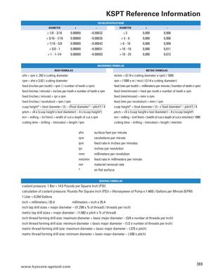 KSPT Reference Information ISO H6 SPECIFICATIONS DIAMETER + – DIAMETER + – ≥ 1/8 - 3/16 0.00000 –0.00032 ≤3 0,000 0,006 > 3/16 - 7/16 0.00000 –0.00035 >3-6 0,000 0,008 > 7/16 - 5/8 0.00000 –0.00043 > 6 - 10 0,000 0,009 > 5/8 - 1 0.00000 –0.00051 > 10 - 18 0,000 0,011 > 1 - 1-1/4 0.00000 –0.00063 > 18 - 25 0,000 0,013 MACHINING FORMULAS INCH FORMULAS METRIC FORMULAS sfm = rpm x .262 x cutting diameter m/min = (3.14 x cutting diameter x rpm) / 1000 rpm = sfm x 3.82 / cutting diameter rpm = (1000 x m / min) / (3.14 x cutting diameter) feed (inches per tooth) = ipm / ( number of teeth x rpm) feed (mm per tooth) = millimeters per minute / (number of teeth x rpm) feed (inches / minute) = inches per tooth x number of teeth x rpm feed (mm/minute) = feed per tooth x number of teeth x rpm feed (inches / minute) = ipr x rpm feed (mm/minute) = mmr x rpm feed (inches / revolution) = ipm / rpm feed (mm per revolution) = mmr / rpm cusp height* = (tool diameter / 2) – √(tool diameter2 – pitch2) / 4 cusp height* = (tool diameter / 2) –√ (tool diameter2 – pitch2) / 4 pitch = √4 x (cusp height x tool diameter) – 4 x (cusp height2) pitch = √4 x (cusp height x tool diameter) – 4 x (cusp height2) mrr – milling – (in3/min) = width of cut x depth of cut x ipm mrr – milling – (cm3/min) = (width of cut x depth of cut x mm/min) / 1000 cutting time – drilling – (minutes) = length / ipm cutting time – drilling – (minutes) = length / mm/min sfm surface feet per minute rpm revolutions per minute ipm feed rate in inches per minutes ipr inches per revolution mmr millimeters per revolution mm/min feed rate in millimeters per minute mrr material removal rate * on flat surface GENERAL FORMULAS coolant pressure: 1 Bar = 14.5 Pounds per Square Inch (PSI) calculation of coolant pressure: Pounds Per Square Inch (PSI) = (Horsepower of Pump x 1.460) / Gallons per Minute (GPM) 1 Liter = 0.254 Gallons inch = millimeters / 25.4 millimeters = inch x 25.4 inch tap drill sizes = major diameter – ((1.299 x % of thread) / threads per inch) metric tap drill sizes = major diameter – (1.082 x pitch x % of thread) inch thread forming drill size: maximum diameter = basic major diameter – (3/8 x number of threads per inch) inch thread forming drill size: minimum diameter = basic major diameter – (1/2 x number of threads per inch) metric thread forming drill size: maximum diameter = basic major diameter – (.375 x pitch) metric thread forming drill size: minimum diameter = basic major diameter – (.500 x pitch) www.kyocera-sgstool.com 369