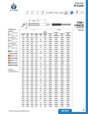 FRACTIONAL 77 H-Carb H-CARB POS 7 ≠ LF APMX 77M • DC DCONNCD 77MCR RE METRIC SERIES TOLERANCES (mm) mm EDP NO. CONTINUED 6 DIAMETER NON- DC = +0,000/–0,030 CUTTING TI-NAMITE-A TI-NAMITE-M CUTTING LENGTH OVERALL SHANK CORNER CENTER TI-NAMITE-A (TA) TI-NAMITE-M (TM) DCON = h6 DIAMETER OF CUT LENGTH DIAMETER RADIUS DIAMETER (TA) EDP NO. (TM) EDP NO. RE = +0,000 / -0,050 DC APMX LF DCON RE NCD EDP NO. CHIP BREAKER EDP NO. CHIP BREAKER >6–10 DIAMETER 12,0 48,0 100,0 12,0 – 4,06 74456 74458 74457 74459 DC = +0,000/–0,040 12,0 48,0 100,0 12,0 0,5 4,06 74460 74462 74461 74463 DCON = h6RE= +0,000 / -0,050 12,0 48,0 100,0 12,0 1,0 4,06 74464 74466 74465 74467 >10–25 DIAMETER 16,0 40,0 92,0 16,0 – 5,41 74468 74470 74469 74471 DC = +0,000/–0,050 16,0 40,0 92,0 16,0 0,5 5,41 74472 74474 74473 74475 DCON = h6RE= +0,000 / -0,050 16,0 40,0 92,0 16,0 1,0 5,41 74476 74478 74477 74479 16,0 48,0 100,0 16,0 – 5,41 74480 74482 74481 74483 STEELS 16,0 48,0 100,0 16,0 0,5 5,41 74484 74486 74485 74487 STAINLESS STEELS 16,0 48,0 100,0 16,0 1,0 5,41 74488 74490 74489 74491 CAST IRON 16,0 64,0 115,0 16,0 – 5,41 74492 74494 74493 74495 16,0 64,0 115,0 16,0 0,5 5,41 74496 74498 74497 74499 HIGH TEMP ALLOYS 16,0 64,0 115,0 16,0 1,0 5,41 74500 74502 74501 74503 TITANIUM 20,0 50,0 100,0 20,0 – 6,76 74504 74506 74505 74507 NON-FERROUS 20,0 50,0 100,0 20,0 0,5 6,76 74508 74510 74509 74511 HARDENED STEELS 20,0 50,0 100,0 20,0 1,0 6,76 74512 74514 74513 74515 20,0 50,0 100,0 20,0 2,0 6,76 74516 74518 74517 74519 For patent 20,0 60,0 115,0 20,0 – 6,76 74520 74522 74521 74523 information visitwww.ksptpatents.com20,0 60,0 115,0 20,0 0,5 6,76 74524 74526 74525 74527 20,0 60,0 115,0 20,0 1,0 6,76 74528 74530 74529 74531 20,0 60,0 115,0 20,0 2,0 6,76 74532 74534 74533 74535 20,0 80,0 140,0 20,0 – 6,76 74536 74538 74537 74539 20,0 80,0 140,0 20,0 0,5 6,76 74540 74542 74541 74543 20,0 80,0 140,0 20,0 1,0 6,76 74544 74546 74545 74547 20,0 80,0 140,0 20,0 2,0 6,76 74548 74550 74549 74551 25,0 63,0 135,0 25,0 – 8,45 74552 74554 74553 74555 25,0 63,0 135,0 25,0 1,0 8,45 74556 74558 74557 74559 25,0 63,0 135,0 25,0 2,0 8,45 74560 74562 74561 74563 25,0 63,0 135,0 25,0 3,0 8,45 74564 74566 74565 74567 25,0 75,0 150,0 25,0 – 8,45 74568 74570 74569 74571 25,0 75,0 150,0 25,0 1,0 8,45 74572 74574 74573 74575 25,0 75,0 150,0 25,0 2,0 8,45 74576 74578 74577 74579 25,0 75,0 150,0 25,0 3,0 8,45 74580 74582 74581 74583 25,0 100,0 170,0 25,0 – 8,45 74584 74586 74585 74587 25,0 100,0 170,0 25,0 1,0 8,45 74588 74590 74589 74591 25,0 100,0 170,0 25,0 2,0 8,45 74592 74594 74593 74595 25,0 100,0 170,0 25,0 3,0 8,45 74596 74598 74597 74599 www.kyocerEaN-DsgMstILoLoSl.com END MILLS 85