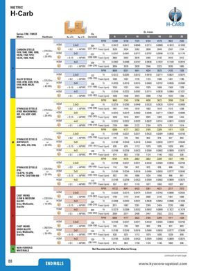METRIC H-Carb 77 Ap H-CARB Ae AeSeries 77M, 77MCRVc D1 • mm Metric Hardness Ae x D1 Ap x D1 (m/min) 6 8 10 12 16 20 25 RPM 12208 9156 7325 6104 4578 3662 2930 HSM 2.5xD 284 Fz 0.0413 0.0411 0.0640 0.0711 0.0889 0.1013 0.1050 CARBON STEELS1018, 1040, 1080, 1090,10L50, 1140, 1212,12L15, 1525, 1536≤ 275 Bhnor≤ 28 HRcHSM≤ 0.2≤ APMX(227-341) Feed (ipm)3529263432823038 2849 2597 21543xD257Fz0.03470.04610.07170.07970.09960.11350.1176≤ 0.15≤ APMX(206-308) Feed (ipm)2965295536763405319229102412 HSM 4xD 230 Fz 0.0362 0.0480 0.0747 0.0830 0.1037 0.1182 0.0919 ≤ 0.1 ≤ APMX (184-276) Feed (ipm) 3094 3076 3830 3546 3323 3030 1885 P RPM 8068 6051 4841 4034 3025 2420 1936 HSM 2.5xD 132 Fz 0.0213 0.0285 0.0512 0.0610 0.0711 0.0827 0.0875 ALLOY STEELS4140, 4150, 4320, 5120,5150, 8630, 86L20,50100≤ 375 Bhnor≤ 40 HRcHSM≤ 0.2≤ APMX(106-159) Feed (ipm)1203 1207 1735 1723 1506 1401 11863xD138Fz0.02390.03190.05740.06830.07970.09260.0980≤ 0.15≤ APMX(111-166) Feed (ipm)1350135119451929168815691328 HSM 4xD 152 Fz 0.0249 0.0332 0.0597 0.0711 0.0830 0.0964 0.1021 ≤ 0.1 ≤ APMX (122-182) Feed (ipm) 1406 1406 2023 2008 1758 1633 1384 RPM 9660 7245 5796 4830 3623 2898 2318 HSM 2.5xD 197 Fz 0.0216 0.0285 0.0448 0.0533 0.0635 0.0747 0.0800 STAINLESS STEELS(FREE MACHINING)303, 416, 420F, 430F,440F≤ 275 BhnorHSM≤ 28 HRc≤ 0.2≤ APMX(158-236) Feed (ipm)1461 1445 1818 1803 1610 1515 12983xD204Fz0.02420.03190.05020.05980.07110.08370.0896≤ 0.15≤ APMX(163-245) Feed (ipm)1636161820372022180316981454 HSM 4xD 182 Fz 0.0252 0.0332 0.0523 0.0622 0.0741 0.0871 0.0933 ≤ 0.1 ≤ APMX (146-218) Feed (ipm) 1704 1684 2122 2104 1879 1767 1514 RPM 6369 4777 3822 3185 2389 1911 1529 HSM 2.5xD 130 Fz 0.0168 0.0221 0.0371 0.0432 0.0584 0.0693 0.0750 STAINLESS STEELS ≤ 275 Bhn ≤ 0.2 ≤ APMX (104-156) Feed (ipm) 749 739 993 963 976 927 803 M (DIFFICULT) or HSM 3xD 134 Fz 0.0188 0.0248 0.0416 0.0484 0.0655 0.0777 0.0840 304, 304L, 316, 316L ≤ 28 HRc ≤ 0.15 ≤ APMX (107-161) Feed (ipm) 838 829 1113 1079 1095 1039 899 HSM 4xD 120 Fz 0.0196 0.0258 0.0433 0.0504 0.0682 0.0809 0.0875 ≤ 0.1 ≤ APMX (96-144) Feed (ipm) 874 863 1158 1124 1140 1082 936 RPM 6104 4578 3662 3052 2289 1831 1465 HSM 2.5xD 124 Fz 0.0168 0.0221 0.0371 0.0432 0.0584 0.0693 0.0750 STAINLESS STEELS(PH)13-8 PH, 15-5PH,17-4 PH, CUSTOM 450≤ 325 Bhnor≤ 35 HRcHSM≤ 0.2≤ APMX(99-149)Feed (ipm) 718 708 952 923 936 888 7693xD129Fz0.01880.02480.04160.04840.06550.07770.0840≤ 0.15≤ APMX(103-155) Feed (ipm)803795106610341050996861 HSM 4xD 115 Fz 0.0196 0.0258 0.0433 0.0504 0.0682 0.0809 0.0875 ≤ 0.1 ≤ APMX (92-138) Feed (ipm) 837 827 1110 1077 1093 1037 897 RPM 10722 8041 6433 5361 4021 3217 2573 HSM 2.5xD 218 Fz 0.0239 0.0315 0.0474 0.0559 0.0762 0.0880 0.0925 CAST IRONS(LOW & MEDIUM ≤ 220 Bhn ≤ 0.2 ≤ APMX (174-262) Feed (ipm) 1794 1773 2135 2098 2145 1981 1666 ALLOY) or HSM 3xD 225 Fz 0.0268 0.0353 0.0531 0.0626 0.0854 0.0986 0.1036 Gray, Malleable, ≤ 19 HRcDuctile ≤ 0.15 ≤ APMX (180-270) Feed (ipm) 2011 1987 2391 2349 2404 2220 1866 HSM 4xD 202 Fz 0.0279 0.0368 0.0553 0.0652 0.0889 0.1027 0.1079 ≤ 0.1 ≤ APMX (162-242) Feed (ipm) 2094 2071 2490 2447 2502 2312 1944 P RPM 6369 4777 3822 3185 2389 1911 1529 HSM 2.5xD 130 Fz 0.0168 0.0221 0.0371 0.0432 0.0584 0.0693 0.0750 CAST IRONS(HIGH ALLOY)Gray, Malleable,Ductile≤ 260 Bhn≤ 0.2 ≤ APMX (104-156) Feed (ipm) 749 739 993 963 976 927 803orHSM3xD134Fz0.01880.02480.04160.04840.06550.07770.0840≤ 26 HRc≤ 0.15≤ APMX(107-161) Feed (ipm)8388291113107910951039899 HSM 4xD 120 Fz 0.0196 0.0258 0.0433 0.0504 0.0682 0.0809 0.0875 ≤ 0.1 ≤ APMX (96-144) Feed (ipm) 874 863 1158 1124 1140 1082 936 N NON-FERROUSMATERIALS Not Recommended for this Material Group continued on next page 88 END MILLS wwwE.kNyDoMceILraLS-sgstool.com