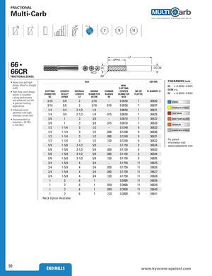 FRACTIONAL Multi-Carb 35° POS 7 9 11 LF APMX 66 • 66CR DC DCONNCD FRACTIONAL SERIES RE • Heavy core and rigid inch EDP NO. TOLERANCES (inch) design allow for straight NON- DC = +0.0000/–0.0020 walls• High flute count designresults in smoother CUTTINGCUTTINGLENGTHOVERALLSHANKCORNERCENTERNO. OFTI-NAMITE-XDCON = h6DIAMETEROF CUTLENGTHDIAMETERRADIUSDIAMETERFLUTESRE= +0.0000/–0.0020 cutting performance DC APMX LF DCON RE NCD and enhanced tool life 3/16 5/8 2 3/16 – 0.0550 7 36620in precise finishing STEELS applications 3/16 5/8 2 3/16 .010 0.0550 7 36627 STAINLESS STEELS • Enhanced corner 1/4 3/4 2-1/2 1/4 – 0.0650 7 36621 geometry with tighttolerance corner radii1/4 3/4 2-1/2 1/4 .015 0.0650 7 36628 CAST IRON • Recommended for 3/8 1 3 3/8 – 0.0810 7 36622 HIGH TEMP ALLOYS materials ≤ 45 HRc(≤ 420 Bhn) 3/8 1 3 3/8 .015 0.0810 7 36629 TITANIUM 1/2 1-1/4 3 1/2 – 0.1340 9 36623 1/2 1-1/4 3 1/2 .030 0.1340 9 36630 HARDENED STEELS 1/2 1-1/4 3 1/2 .090 0.1340 9 36631 1/2 1-1/4 3 1/2 .120 0.1340 9 36632 For patentinformation visit 5/8 1-5/8 3-1/2 5/8 – 0.1150 9 36624 www.ksptpatents.com 5/8 1-5/8 3-1/2 5/8 .030 0.1150 9 36633 5/8 1-5/8 3-1/2 5/8 .090 0.1150 9 36634 5/8 1-5/8 3-1/2 5/8 .120 0.1150 9 36635 3/4 1-5/8 4 3/4 – 0.1750 11 36625 3/4 1-5/8 4 3/4 .030 0.1750 11 36636 3/4 1-5/8 4 3/4 .090 0.1750 11 36637 3/4 1-5/8 4 3/4 .120 0.1750 11 36638 1 2 6 1 – 0.3000 11 36626 1 2 6 1 .030 0.3000 11 36639 1 2 6 1 .090 0.3000 11 36640 1 2 6 1 .120 0.3000 11 36641 Neck Option Available 90 END MILLS wwwE.kNyDoMceILraLS-sgstool.com
