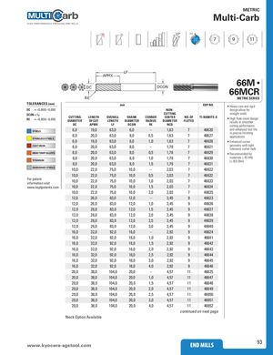 METRIC Multi-Carb 35° POS 7 9 11 LF APMX 66M • DC DCON 66MCR RE METRIC SERIES TOLERANCES (mm) mm EDP NO. • Heavy core and rigid DC = +0,000/–0,050 NON- design allow for DCON = h6RE= +0,000/–0,050 CUTTING straight wallsCUTTINGLENGTHOVERALLSHANKCORNERCENTERNO. OFTI-NAMITE-X• High flute count designDIAMETEROF CUTLENGTHDIAMETERRADIUSDIAMETERFLUTESresults in smoother DC APMX LF DCON RE NCD cutting performance STEELSSTAINLESS STEELS 6,0 19,0 63,0 6,0 – 1,63 7 46620 and enhanced tool life8,020,063,08,00,51,63746627in precise finishingapplications 6,0 19,0 63,0 6,0 1,0 1,63 7 46628 • Enhanced corner CAST IRON 8,0 20,0 63,0 8,0 – 1,78 7 46621 geometry with tighttolerance corner radii HIGH TEMP ALLOYS 8,0 20,0 63,0 8,0 0,5 1,78 7 46629 • Recommended for 8,0 20,0 63,0 8,0 1,0 1,78 7 46630 materials ≤ 45 HRc TITANIUM (≤ 420 Bhn) 8,0 20,0 63,0 8,0 1,5 1,78 7 46631 HARDENED STEELS 10,0 22,0 75,0 10,0 – 2,03 7 46622 10,0 22,0 75,0 10,0 0,5 2,03 7 46632 For patentinformation visit 10,0 22,0 75,0 10,0 1,0 2,03 7 46633 www.ksptpatents.com 10,0 22,0 75,0 10,0 1,5 2,03 7 46634 10,0 22,0 75,0 10,0 2,0 2,03 7 46635 12,0 26,0 83,0 12,0 – 3,45 9 46623 12,0 26,0 83,0 12,0 1,0 3,45 9 46636 12,0 26,0 83,0 12,0 1,5 3,45 9 46637 12,0 26,0 83,0 12,0 2,0 3,45 9 46638 12,0 26,0 83,0 12,0 2,5 3,45 9 46639 12,0 26,0 83,0 12,0 3,0 3,45 9 46640 16,0 32,0 92,0 16,0 – 2,92 9 46624 16,0 32,0 92,0 16,0 1,0 2,92 9 46641 16,0 32,0 92,0 16,0 1,5 2,92 9 46642 16,0 32,0 92,0 16,0 2,0 2,92 9 46643 16,0 32,0 92,0 16,0 2,5 2,92 9 46644 16,0 32,0 92,0 16,0 3,0 2,92 9 46645 16,0 32,0 92,0 16,0 4,0 2,92 9 46646 20,0 38,0 104,0 20,0 – 4,57 11 46625 20,0 38,0 104,0 20,0 1,0 4,57 11 46647 20,0 38,0 104,0 20,0 1,5 4,57 11 46648 20,0 38,0 104,0 20,0 2,0 4,57 11 46649 20,0 38,0 104,0 20,0 2,5 4,57 11 46650 20,0 38,0 104,0 20,0 3,0 4,57 11 46651 20,0 38,0 104,0 20,0 4,0 4,57 11 46652 continued on next page Neck Option Available www.kyocerEaN-DsgMstILoLoSl.com END MILLS 93