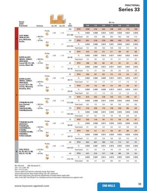 FRACTIONAL Series 33 Ap Series Ae Ae DC • in 33CR Vc Fractional Hardness Ae x DC Ap x DC (sfm) 1/8 1/4 3/8 1/2 5/8 3/4 1 340 RPM 10390 5195 3463 2598 2078 1732 1299 Profile ≤ 0.5 ≤ 1.5 Fz 0.0003 0.0008 0.0016 0.0021 0.0026 0.0027 0.0029 CAST IRONSK(HIGH ALLOY)Gray, Malleable,Ductile≤ 260 Bhnor≤ 26 HRcSlot (272-408) Feed (ipm) 9.4 12.5 16.6 16.4 16.2 14.0 11.3270RPM8251412627502063165013751031 1 ≤1 Fz 0.0003 0.0008 0.0016 0.0021 0.0026 0.0027 0.0029 (216-324) Feed (ipm) 7.4 9.9 13.2 13.0 12.9 11.1 9.0 80 RPM 2445 1222 815 611 489 407 306 Profile ≤ 0.5 ≤ 1.5 Fz 0.0003 0.0007 0.0013 0.0017 0.0021 0.0022 0.0024 SUPER ALLOYS (64-96) (NICKEL, COBALT, ≤ 300 Bhn Feed (ipm) 1.9 2.6 3.2 3.1 3.1 2.7 2.2 IRON BASE) or Inconel 601, 617, 625, ≤ 32 HRc 65 RPM 1986 993 662 497 397 331 248 Incoloy, Monel 400 Slot 1 ≤1 Fz 0.0003 0.0007 0.0013 0.0017 0.0021 0.0022 0.0024 (52-78) Feed (ipm) 1.5 2.1 2.6 2.5 2.5 2.2 1.8 62 RPM 1895 947 632 474 379 316 237 Profile SUPER ALLOYS ≤ 0.5(NICKEL, COBALT,IRON BASE)Inconel 718, X-750,Incoloy, Waspaloy,Hastelloy, Rene≤ 400 Bhnor≤ 43 HRcSlot1≤ 1.5Fz0.00020.00050.00090.00120.00150.00160.0017(50-74)Feed (ipm)1.11.41.71.71.71.51.249RPM1497749499374299250187≤1Fz0.00020.00050.00090.00120.00150.00160.0017 (39-59) Feed (ipm) 0.9 1.1 1.3 1.3 1.3 1.2 1.0 S 215 RPM 6570 3285 2190 1643 1314 1095 821 Profile ≤ 0.5 ≤ 1.5 Fz 0.0003 0.0008 0.0015 0.0020 0.0025 0.0026 0.0028 TITANIUM ALLOYS (172-258) Pure Titanium, ≤ 350 Bhn Feed (ipm) 5.9 7.9 9.9 9.9 9.9 8.5 6.9 Ti6Al4V, or Ti6Al2Sn4Zr2Mo, ≤ 38 HRc 170 RPM 5195 2598 1732 1299 1039 866 649 Ti4Al4Mo2Sn0.5Si Slot 1 ≤1 Fz 0.0003 0.0008 0.0015 0.0020 0.0025 0.0026 0.0028 (136-204) Feed (ipm) 4.7 6.2 7.8 7.8 7.8 6.8 5.5 75 RPM 2292 1146 764 573 458 382 287 TITANIUM ALLOYS(DIFFICULT) Profile ≤ 0.5Ti10Al2Fe3Al,Ti5Al5V5Mo3Cr,Ti7Al4Mo,Ti3Al8V6Cr4Zr4Mo,≤ 440 Bhnor≤ 47 HRcSlot≤ 1.5Fz0.00030.00080.00150.00200.00250.00260.0028(60-90)Feed (ipm)2.12.83.43.43.43.02.460RPM1834917611458367306229 Ti6Al6V6Sn,Ti15V3 Cr3Sn3Al 1 ≤1 Fz 0.0003 0.0008 0.0015 0.0020 0.0025 0.0026 0.0028(48-72) Feed (ipm) 1.7 2.2 2.8 2.8 2.8 2.4 1.9 185 RPM 5654 2827 1885 1413 1131 942 707 Profile ≤ 0.5 ≤ 1.5 Fz 0.0003 0.0007 0.0014 0.0018 0.0023 0.0024 0.0025 (148-222) TOOL STEELS ≤ 375 Bhn Feed (ipm) 5.1 5.9 7.9 7.6 7.8 6.8 5.3 H A2, D2, H13, L2, M2, or P20, S7, T15, W2 ≤ 40 HRc 145 RPM 4431 2216 1477 1108 886 739 554 Slot 1 ≤1 Fz 0.0003 0.0007 0.0014 0.0018 0.0023 0.0024 0.0025 (116-174) Feed (ipm) 4.0 4.7 6.2 6.0 6.1 5.3 4.2 Bhn (Brinell) HRc (Rockwell C) rpm = Vc x 3.82 / DC ipm = Fz x 3 x rpm reduce speed and feed for materials harder than listed reduce feed and Ae when finish milling (.02 x DC maximum) feed rates listed have chip thinning adjustments included where applicable refer to the SGS Tool Wizard® for complete technical information (www.kyocera-sgstool.com) www.kyocerEaN-DsgMstILoLoSl.com END MILLS 99