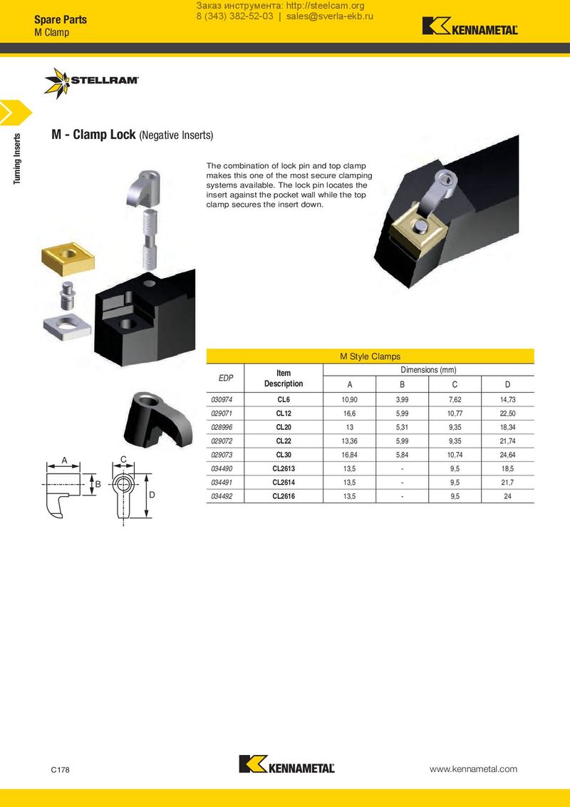 Заказ инструмента: http://steelcam.org Spare Parts 8 (343) 382-52-03 | sales@sverla-ekb.ru M Clamp Turning Inserts M - Clamp Lock (Negative Inserts) The combination of lock pin and top clamp makes this one of the most secure clamping systems available. The lock pin locates the insert against the pocket wall while the top clamp secures the insert down. M Style Clamps EDP Item Dimensions (mm) Description A B C D 030974 CL6 10,90 3,99 7,62 14,73 029071 CL12 16,6 5,99 10,77 22,50 028996 CL20 13 5,31 9,35 18,34 029072 CL22 13,36 5,99 9,35 21,74 A C 029073 CL30 16,84 5,84 10,74 24,64 034490 CL2613 13,5 - 9,5 18,5 B 034491 CL2614 13,5 - 9,5 21,7 D 034492 CL2616 13,5 - 9,5 24 C178 www.kennametal.com