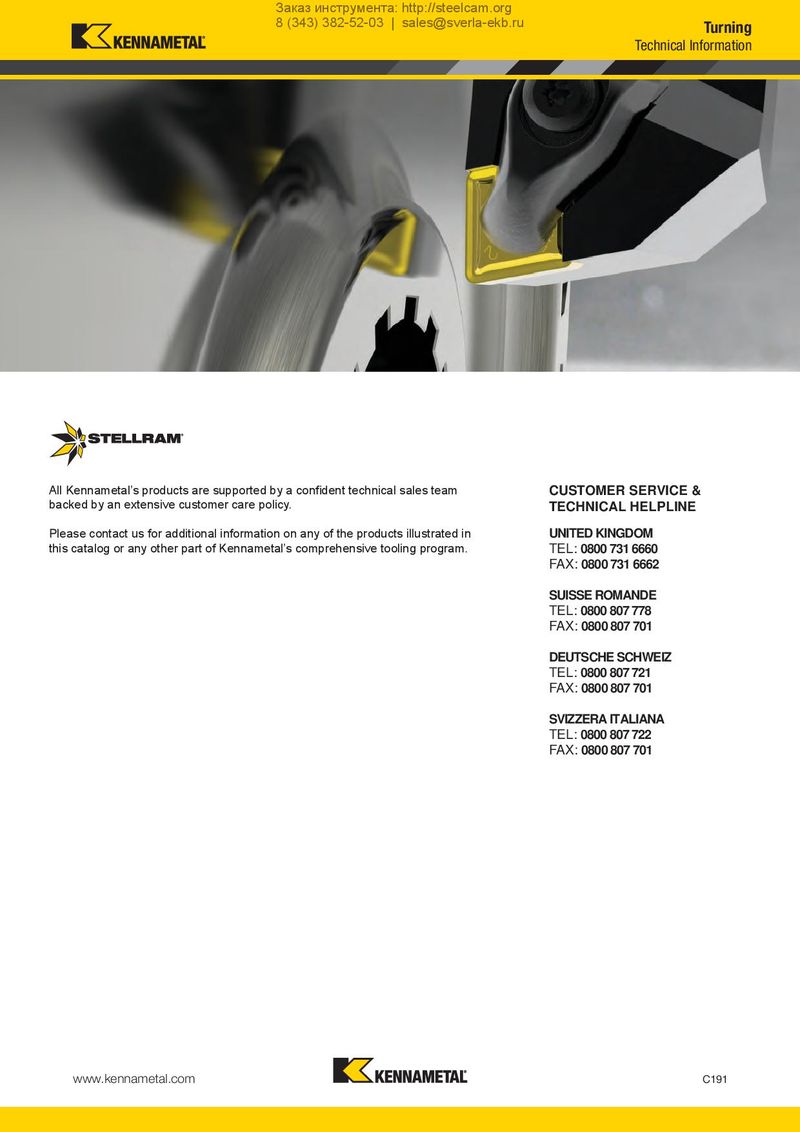 Заказ инструмента: http://steelcam.org 8 (343) 382-52-03 | sales@sverla-ekb.ru Turning Technical Information All Kennametal’s products are supported by a confident technical sales team CUSTOMER SERVICE & backed by an extensive customer care policy. TECHNICAL HELPLINE Please contact us for additional information on any of the products illustrated in UNITED KINGDOM this catalog or any other part of Kennametal’s comprehensive tooling program. TEL: 0800 731 6660 FAX: 0800 731 6662 SUISSE ROMANDE TEL: 0800 807 778 FAX: 0800 807 701 DEUTSCHE SCHWEIZ TEL: 0800 807 721 FAX: 0800 807 701 SVIZZERA ITALIANA TEL: 0800 807 722 FAX: 0800 807 701 www.kennametal.com C191