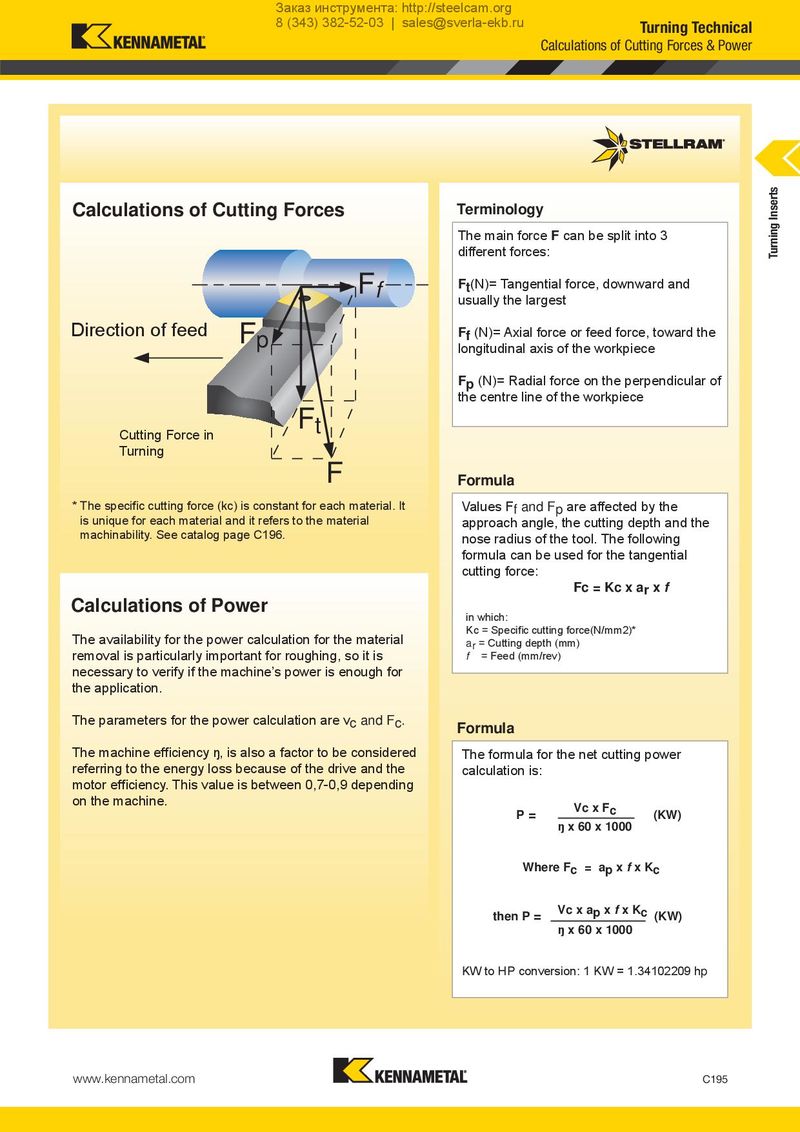 Заказ инструмента: http://steelcam.org 8 (343) 382-52-03 | sales@sverla-ekb.ru Turning Technical Calculations of Cutting Forces & Power Calculations of Cutting Forces Terminology Turning Inserts The main force F can be split into 3 different forces: Ff Ft(N)= Tangential force, downward and usually the largest DDirierecctitoionn ooff ffeeeedd Fp Ff (N)= Axial force or feed force, toward the longitudinal axis of the workpiece Fp (N)= Radial force on the perpendicular of the centre line of the workpiece Cutting Force in Ft Turning F Formula * The specific cutting force (kc) is constant for each material. It Values Ff and Fp are affected by the is unique for each material and it refers to the material approach angle, the cutting depth and the machinability. See catalog page C196. nose radius of the tool. The following formula can be used for the tangential cutting force: Fc = Kc x ar x f Calculations of Power in which: The availability for the power calculation for the material Kc = Specific cutting force(N/mm2)* removal is particularly important for roughing, so it is ar = Cutting depth (mm) f = Feed (mm/rev) necessary to verify if the machine’s power is enough for the application. The parameters for the power calculation are vc and Fc. Formula The machine efficiency ŋ, is also a factor to be considered The formula for the net cutting power referring to the energy loss because of the drive and the calculation is: motor efficiency. This value is between 0,7-0,9 depending on the machine. Vc x Fc P= (KW) ŋ x 60 x 1000 Where Fc = ap x f x Kc then P = Vc x ap x f x Kc (KW) ŋ x 60 x 1000 KW to HP conversion: 1 KW = 1.34102209 hp www.kennametal.com C195