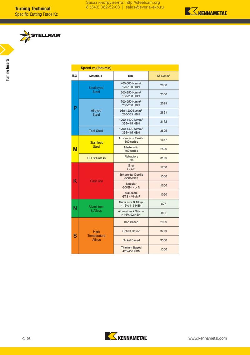 Заказ инструмента: http://steelcam.org Turning Technical 8 (343) 382-52-03 | sales@sverla-ekb.ru Specific Cutting Force Kc Turning Inserts Speed vc (feet/min) ISO Materials Rm Kc:N/mm2 400-600 N/mm2 2050 Unalloyed 120-180 HBN Steel 600-950 N/mm2 2300 180-200 HBN 700-950 N/mm2 2599 P 200-280 HBN Alloyed 950-1200 N/mm2 2851 Steel 280-355 HBN 1200-1400 N/mm2 3172 355-415 HBN Tool Steel 1200-1400 N/mm2 3895 355-415 HBN Austenitic + Ferritic 1847 Stainless 300 series M Steel Martensitic 2599 400 series PH Stainless Refractory 3199 P.H. Grey 1200 GG-Ft Spheroidal-Ductile 1500 K Cast Iron GGG-FGS Nodular 1600 GGGNi - L- N Malleable 1050 GTS - MN/MP Aluminium & Alloys 827 N Aluminium < 16% 116 HBN & Alloys Aluminium + Silicon 965 > 16% 92 HBN Iron Based 2999 High Cobalt Based 3799 S Temperature Alloys Nickel Based 3500 Titanium Based 1500 425-456 HBN C196 www.kennametal.com