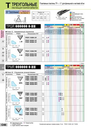 Позитивные пластины Финишная обработкаФинишная обработкаЧистовая обработкаЧистовая обработкаПолучистовая обработка Глубина резания, ммГлубина резания, ммГлубина резания, ммГлубина резания, ммГлубина резания, мм T110AT110A T1200AT1200A T1500AT1500A T2000ZT2000Z T3000ZT3000Z AC530UAC530U AC700GAC700G AC900GAC900G AC810PAC810P AC820PAC820P AC830PAC830P AC2000AC2000 AC3000AC3000 AC610MAC610M AC630MAC630M AC530UAC530U AC510UAC510U AC520UAC520U AC530UAC530U AC410KAC410K AC420KAC420K AC700GAC700G AC900GAC900G NB100CNB100C G10EG10E H1H1 T ТРЕУГОЛЬНЫЕ ПЛАСТИНЫ ДЛЯ ТОКАРНОЙ ОБРАБОТКИ Позитивные пластины TP– – 11° для финишной и чистовой об-ки 60° Треугольные 11° Задний уголБез отверстия Размеры, ммTP– –lød (IC)sd1 P СтальM Нержавеющая сталь K Чугун 1103 - - 11,0 6,35 3,18 – ”S … CTFP…11/16” - тип N Цветные металлы 1603 - - 16,5 9,525 3,18 – (a Склад в Японии) S Жаропр. и тит. сплавы H Закаленная сталь 1 Керамика TPGR llllll l-nn P M S K HKNКерметТвердый сплав1 Тв. сплавБез покрытияС покрытием ZXС покрытиемС покрытием ZXС покрытиемБез покр. Класс G Направленный стружколом Применение Форма Обозначение ISO r TPGR 110304 LW 0,4 sl TPGR 160304 LW 0,4 sl L-W TPGR 160308 LW 0,8 sl Подача, мм/об TPGR 110304 RW 0,4 sl TPGR 160304 RW 0,4 sl R-W TPGR 160308 RW 0,8 sl Подача, мм/об 1 Керамика TPMR llllll l-nn P M S K HKNКерметТвердый сплав1 Тв. сплавБез покрытия С покрытием ZXС покрытиемС покрытием ZXС покрытиемБез покр. Класс M Стружколом сложной формы Применение Форма Обозначение ISO r TPMR 110302 NFK 0,2 sl TPMR 110304 NFK 0,4 lsl TPMR 110308 NFK 0,8 lsl NFK TPMR 160304 NFK 0,2 sl TPMR 160308 NFK 0,4 sl Подача, мм/об TPMR 110304 NSF 0,4 lls TPMR 110308 NSF 0,8 lls NSF TPMR 160304 NSF 0,4 l lss TPMR 160308 NSF 0,8 l lss TPMR 160312 NSF 1,2 l Подача, мм/об TPMR 110304 NUJ 0,4 s TPMR 110308 NUJ 0,8 s TPMR 160304 NUJ 0,4 ss NUJ TPMR 160308 NUJ 0,8 ss Подача, мм/об l = Европейский склад l = Первый выбор C48 l = Склад в Японииs = Будет заменен новой позицией Упаковочная единица и пример заказа; 10 шт. TPGR 110304 LW, T1200A