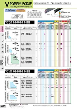 Позитивные пластины Финишная обработкаФинишная обработкаЧистовая обработкаЧистовая обработкаЧистовая обработка Глубина резания, ммГлубина резания, ммГлубина резания, ммГлубина резания, ммГлубина резания, мм T110AT110A T1200AT1200A T1500AT1500A T2000ZT2000Z T3000ZT3000Z AC530UAC530U AC700GAC700G AC900GAC900G AC810PAC810P AC820PAC820P AC830PAC830P AC2000AC2000 AC3000AC3000 AC610MAC610M AC630MAC630M AC530UAC530U AC510UAC510U AC520UAC520U AC530UAC530U AC410KAC410K AC420KAC420K AC700GAC700G AC900GAC900G NB100CNB100C G10EG10E H1H1 V РОМБИЧЕСКИЕ ПЛАСТИНЫ ДЛЯ ТОКАРНОЙ ОБРАБОТКИ Позитивные пластины VC– – 7° для финишной и чистовой об-ки 35° Ромбические 7° Задний уголС отверстием Размеры, ммVC – –lød (IC)sd10802--8,34,762,382,31103 - -11,06,353,182,81604 - -16,69,5254,764,4 P СтальM Нержавеющая стальa D37K Чугун”S …-SV…C” - типN Цветные металлы(a Склад в Японии)SЖаропр.и тит. сплавы H Закаленная сталь 1 Керамика VCGT llllll l-nn P M S K HKNКерметТвердый сплав1 Тв. сплавБез покрытияС покрытием ZXС покрытиемС покрытием ZXС покрытиемБез покр. Класс G Направленный стружколом и стружколом сложной формы Применение Форма Обозначение ISO r VCGT 110301 NFC 0,1 l l l NFC VCGT 110302 NFC 0,2 l l l Подача, мм/об VCGT 110301 LFX 0,1 sl l l ml L-FX VCGT 110302 LFX 0,2 sl l l ml VCGT 110301 RFX 0,1 sl l l ml R-FX VCGT 110302 RFX 0,2 sl l l ml Подача, мм/об VCGT 110302 NAG 0,2 l NAG VCGT 110304 NAG 0,4 l VCGT 160408 NAG 0,8 l VCGT 160412 NAG 1,2 l Подача, мм/об 1 Керамика VCMT llllll l-nn P M S K HKNКерметТвердый сплав1 Тв. сплавБез покрытияС покрытием ZXС покрытиемС покрытием ZXС покрытиемБез покр. Класс M Стружколом сложной формы Применение Форма Обозначение ISO r VCMT 110302 NSU 0,2 m VCMT 110304 NSU 0,4 m NSU VCMT 110308 NSU 0,8 m VCMT 160404 NSU 0,4 ls l lmssl l l l l l l s VCMT 160408 NSU 0,8 ls l lmssl l l l l l l s Подача, мм/об NSK VCMT 160404 NSKVCMT 160408 NSK 0,40,8 s l lss lsl lssl Подача, мм/об l = Европейский склад l = Первый выбор C50 l = Склад в Японииs = Будет заменен новой позицией Упаковочная единица и пример заказа; 10 шт. VCGT 110202 LFX, AC530U