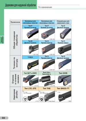 Державки для наружной обработки Общая токарная обработкаТочение поконтуруОтрезкаи точениеканавокНарезаниерезьбы Державки для наружной обработки По назначению Применение Экономные для Экономные длянегативных пластинпозитивных пластинСпециальные длязакаленной стали Тип P Тип P Тип D Прижим рычагом Прижим рычагом Двойной прижим a D16~D20 a D29, D30 a D10~D15 Тип M Тип S Тип C Двойной прижим Прижим винтом Прижим сверху a D21~D22 a D29~D35 a D23~D25 T-REX Тип S Тип DПрижим винтомДвойной прижим a D8~D9 a D36~D37 a D11, D14 Тип SCT и GWC Sumi Grip иSumi Grip Jr. Тип GWB a F2~F4 a F6~F10 a M23 Тип LTE и STE Тип THE Тип BNGG-TT Шаг Шаг Шаг { 1~4 мм 24~8 Витков/дюйм { 0,8~3 мм 24~10 Витков/дюйм 1~3 мм a F14 a Склад в Японии a M24 D2