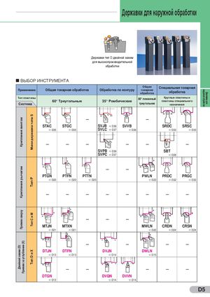наружной обработки Державки для Крепления винтомКрепления рычагомПрижим сверхуДвойной зажим (D)Прижим за углубление (X) Мини-державка типа SТип PТип C и MТип D и X Державки для наружной обработки Державки тип D двойной зажим для высокопроизводительной обработки ВЫБОР ИНСТРУМЕНТА Применение Общая токарная обработка Обработка по контуру ОбщаятокарнаяобработкаСпециальная токарнаяобработка Тип пластины 80° ломанный Круглые пластины и 60° Треугольные 35° Ромбические пластины специального Система треугольник назначения – – – – – – – – STAC STGC SVJB a D36 SVVB SRDC SRSC a D35 a D35 SVLC a D37 a D36 a D33 a D33 – – – – – – – – SVPB a D36 SBT SVPC a D37 a D28 – – – – – – – – PTGN PTFN PTTN PWLN PRDC PRGC a D20 a D20 a D20 a D22 a D32 a D32 – – – – – – – – – – – – – – – – MTJN MTXN MWLN CRDN CRSN a D21 a D21 a D22 a D24 a D24 – – – – – – – – DTJN DTFN DVJN DWLN a D13 a D13 a D14 a D15 – – – – – – – – DTGN DVQN DVVN a D13 a D14 a D14 D5
