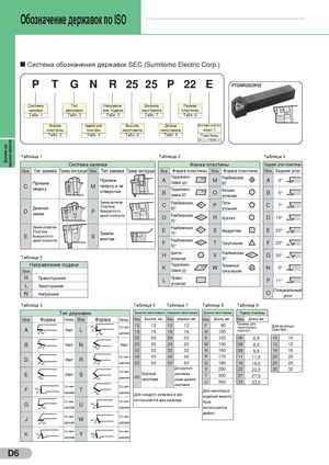 Державки для наружной обработки Обозначение державок по ISO Система обозначения державок SEC (Sumitomo Electric Corp.) P T G N R 25 25 P 22 E PTGNR2525P22 Система Тип Направле- Ширина Размер зажима державки ние подачи хвостовика пластины Табл. 1 Табл. 3 Табл. 5 Табл. 7 Табл. 9 Форма Задний угол Высота Длина Для евро-пластин пластины пластины хвостовика хвостовика формы D Табл. 2 Табл. 4 Табл. 6 Табл. 8 Пластины D n n n 1506ll Таблица 1 Таблица 2 Таблица 4 Система зажима Форма пластины Задний угол пластины Обозн. Тип зажима Пример конструкции Обозн. Тип зажима Пример конструкции Обозн. Форма пластины Обозн. Форма пластины Обозн. Задний угол C Прижимсверху ПрижимMсверху и за A Параллело-грамм 85° 85˚ M Ромбическая 86˚86° A 3°отверстиеBПараллело-грамм 82°82˚OВосьми-угольнаяB5° D Двойнойзажим Зажим рычагом(ПластинаPбазируется по C Ромбическая 80˚ P Пяти- C 7°80°угольнаяодной плоскости)DРомбическая55˚55°RКруглаяD15° Зажим штифтом(ПластинаEбазируется поодной плоскости)S Зажимвинтом E Ромбическая 75˚75° S Квадратная E 20°FРомбическая50˚50°TТреугольнаяF25° Таблица 5 H Шести- V Ромбическая 35˚ G 30°угольная35° Направление подачиОбозн. K Параллело-грамм 55° 55˚ W Ломанный 80˚треугольникN 0° R ПравосторонняяLЛевосторонняя L Прямо-угольная P 11° N Нейтральная O Специальныйугол Таблица 3 Таблица 6 Таблица 7 Таблица 8 Таблица 9 Тип державки Высота хвостовика Ширина хвостовика Длина хвостовика Размер пластины Обозн. Форма Смещ. Обозн. Форма Смещ. Обозн. Высота, мм Обозн. Ширина, мм Обозн. Длина, мм Обозн. Длина, мм A 90˚ 95˚НетL95˚ Со сме- 12 12 12 12щением16161616 F 80 Пример длятреугольныхH100пластин: Для круглыхпластин: 20 20 20 20 K 125 06 6,9 10 10 B Нет N Нет 25 25 25 25 M 150 08 8,2 12 12 75˚ 63˚ 32 32 32 32 N 160 09 9,6 16 16 D Нет R Со сме- 40 40 40 40 P 170 11 11,0 20 20 45˚ 75˚ щением 50 50 50 50 Q 180 16 16,5 25 25 E 60˚ Нет S 45˚Со сме- Со сме- Круглыйщением00хвостовикСо сме-Для круглого S 250 22 22,0 32 32хвостовикаT3002727,5указан диаметрU350хвостовика3333,0 F 90˚ Tщением 60˚ щением Для каждого размера в мм Для некоторыхизделий вместо G Со сме- U 93˚ Со сме- используется два разряда. букв 90˚ щением щением используется дефис. J 93˚ Со сме- Wщением 60˚ Со сме-щением K 75˚ Со сме- Y 85˚ Со сме- щением щением D6