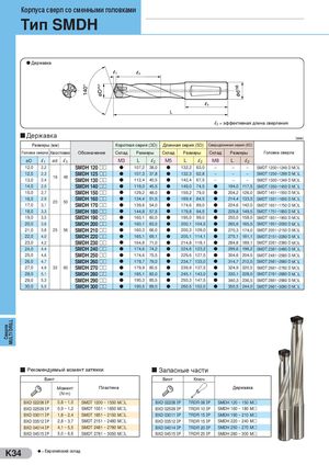 Корпуса сверл со сменными головками Тип SMDH Державка l2 = эффективная длина сверления Державка (мм) Размеры (мм) Короткая серия (3D) Длинная серия (5D) Сверхдлинная серия (8D) Головка сверла Хвостовик Обозначение Склад Размеры Склад Размеры Склад Размеры Головка сверла øD l1 ød l3 M3 L l2 M5 L l2 M8 L l2 12,0 2,2 SMDH 120 ££ l 107,2 38,0 l 132,2 63,0 – – – SMDT 1200~1249 D MlL 12,513,02,3 16 482,4 SMDH 125 ££SMDH 130 ££l 107,3 37,8 l 132,3 62,8 –l112,440,5l142,467,5––– SMDT 1250~1299 D MlL––SMDT 1300~1349 D MlL 14,0 2,5 SMDH 140 ££ l 119,0 45,5 l 149,0 74,5 l 194,0 117,5 SMDT 1350~1450 D MlL 15,0 2,7 SMDH 150 ££ l 129,2 48,0 l 159,2 79,0 l 204,2 126,0 SMDT 1451~1550 D MlL 16,017,02,9 20 503,1 SMDH 160 ££SMDH 170 ££l 134,4 51,5 l 169,4 84,5 l 214,4 133,5 SMDT 1551~1650 D MlLl139,654,0l174,689,0l224,6142,0SMDT 1651~1750 D MlL 18,0 3,3 SMDH 180 ££ l 144,8 57,5 l 179,8 94,5 l 229,8 149,5 SMDT 1751~1850 D MlL 19,0 3,5 SMDH 190 ££ l 160,1 60,0 l 195,0 99,0 l 255,0 158,0 SMDT 1851~1950 D MlL 20,0 3,6 SMDH 200 ££ l 160,1 63,5 l 200,1 104,5 l 265,6 165,5 SMDT 1951~2050 D MlL 21,0 3,8 25 56 SMDH 210 ££ l 160,3 66,0 l 200,3 109,0 l 270,3 174,0 SMDT 2051~2150 D MlL 22,0 4,0 SMDH 220 ££ l 165,1 69,1 l 205,1 114,1 l 275,1 181,1 SMDT 2151~2280 D MlL 23,0 4,2 SMDH 230 ££ l 164,8 71,0 l 214,8 118,1 l 284,8 189,1 SMDT 2281~2380 D MlL 24,0 4,4 SMDH 240 ££ l 174,6 74,2 l 224,6 123,2 l 299,6 196,2 SMDT 2381~2480 D MlL 25,0 4,6 SMDH 250 ££ l 174,6 75,5 l 229,6 127,5 l 304,6 204,5 SMDT 2481~2580 D MlL 26,0 4,7 SMDH 260 ££ l 179,7 79,0 l 234,7 133,0 l 314,7 212,0 SMDT 2581~2680 D MlL 27,0 4,9 32 60 SMDH 270 ££ l 179,9 80,5 l 239,9 137,5 l 324,9 220,5 SMDT 2681~2780 D MlL 28,0 5,1 SMDH 280 ££ l 185,1 83,0 l 245,1 143,0 l 330,1 228,0 SMDT 2781~2880 D MlL 29,0 5,3 SMDH 290 ££ l 190,3 85,5 l 250,3 147,5 l 340,3 236,5 SMDT 2881~2980 D MlL 30,0 5,5 SMDH 300 ££ l 190,5 89,0 l 260,5 152,0 l 350,5 244,0 SMDT 2981~3080 D MlL 1 Рекомендуемый момент затяжки Запасные части Винт Винт Ключ Момент Пластина Державка (N.m) BXD 02208 ΙP 0,8 ~ 1,0 SMDT 1200 ~ 1550 M£L BXD 02208 ΙP TRDR 08 ΙP SMDH 120 ~ 150 M£ BXD 02509 ΙP 0,9 ~ 1,2 SMDT 1551 ~ 1850 M£L BXD 02509 ΙP TRDR 10 ΙP SMDH 160 ~ 180 M£ BXD 03011 ΙP 1,8 ~ 2,4 SMDT 1851 ~ 2150 M£L BXD 03011 ΙP TRDR 15 ΙP SMDH 190 ~ 210 M£ BXD 03512 ΙP 2,8 ~ 3,7 SMDT 2151 ~ 2480 M£L BXD 03512 ΙP TRDR 15 ΙP SMDH 220 ~ 240 M£ BXD 04014 ΙP 4,1 ~ 5,5 SMDT 2481 ~ 2780 M£L BXD 04014 ΙP TRDR 20 ΙP SMDH 250 ~ 270 M£ BXD 04515 ΙP 5,0 ~ 6,6 SMDT 2781 ~ 3050 M£L BXD 04515 ΙP TRDR 25 ΙP SMDH 280 ~ 300 M£ K34 l = Европейский склад Сверла MULTI DRILL