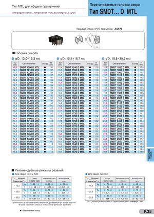 Тип МТL для общего применения Перетачиваемые головки сверл (Углеродистая сталь, легированная сталь, высокопрочный чугун) Тип SMDT… D MTL Твердый сплав с PVD покрытием: ACX70 Головка сверла øD: 12,0~15,3 мм øD: 15,4~18,7 мм øD: 18,8~30,5 мм øD(мм) Обозначение Склад H(мм) øD(мм) Обозначение Склад H (мм) øD(мм) Обозначение Склад H(мм) 12,0 SMDT 1200 D MTL l 9,1 15,4 SMDT 1540 D MTL l 11,0 18,8 SMDT 1880 D MTL l 12,9 12,1 SMDT 1210 D MTL l 9,1 15,5 SMDT 1550 D MTL l 11,0 18,9 SMDT 1890 D MTL l 12,9 12,2 SMDT 1220 D MTL l 9,1 15,6 SMDT 1560 D MTL l 11,0 19,0 SMDT 1900 D MTL l 13,5 12,3 SMDT 1230 D MTL l 9,1 15,7 SMDT 1570 D MTL l 11,0 19,1 SMDT 1910 D MTL l 13,5 12,4 SMDT 1240 D MTL l 9,1 15,8 SMDT 1580 D MTL l 11,0 19,2 SMDT 1920 D MTL l 13,5 12,5 SMDT 1250 D MTL l 9,4 15,9 SMDT 1590 D MTL l 11,0 19,3 SMDT 1930 D MTL l 13,5 12,6 SMDT 1260 D MTL l 9,4 16,0 SMDT 1600 D MTL l 11,6 19,4 SMDT 1940 D MTL l 13,5 12,7 SMDT 1270 D MTL l 9,4 16,1 SMDT 1610 D MTL l 11,6 19,5 SMDT 1950 D MTL l 13,5 12,8 SMDT 1280 D MTL l 9,4 16,2 SMDT 1620 D MTL l 11,6 19,6 SMDT 1960 D MTL l 13,5 12,9 SMDT 1290 D MTL l 9,4 16,3 SMDT 1630 D MTL l 11,6 19,7 SMDT 1970 D MTL l 13,5 13,0 SMDT 1300 D MTL l 9,7 16,4 SMDT 1640 D MTL l 11,6 19,8 SMDT 1980 D MTL l 13,5 13,1 SMDT 1310 D MTL l 9,7 16,5 SMDT 1650 D MTL l 11,6 19,9 SMDT 1990 D MTL l 13,5 13,2 SMDT 1320 D MTL l 9,7 16,6 SMDT 1660 D MTL l 11,6 20,0 SMDT 2000 D MTL l 14,1 13,3 SMDT 1330 D MTL l 9,7 16,7 SMDT 1670 D MTL l 11,6 20,5 SMDT 2050 D MTL l 14,1 13,4 SMDT 1340 D MTL l 9,7 16,8 SMDT 1680 D MTL l 11,6 21,0 SMDT 2100 D MTL l 14,8 13,5 SMDT 1350 D MTL l 10,3 16,9 SMDT 1690 D MTL l 11,6 21,5 SMDT 2150 D MTL l 14,8 13,6 SMDT 1360 D MTL l 10,3 17,0 SMDT 1700 D MTL l 12,2 22,0 SMDT 2200 D MTL l 15,0 13,7 SMDT 1370 D MTL l 10,3 17,1 SMDT 1710 D MTL l 12,2 22,5 SMDT 2250 D MTL l 15,0 13,8 SMDT 1380 D MTL l 10,3 17,2 SMDT 1720 D MTL l 12,2 23,0 SMDT 2300 D MTL l 15,1 13,9 SMDT 1390 D MTL l 10,3 17,3 SMDT 1730 D MTL l 12,2 23,5 SMDT 2350 D MTL l 15,1 14,0 SMDT 1400 D MTL l 10,3 17,4 SMDT 1740 D MTL l 12,2 24,0 SMDT 2400 D MTL l 15,4 14,1 SMDT 1410 D MTL l 10,3 17,5 SMDT 1750 D MTL l 12,2 24,5 SMDT 2450 D MTL l 15,4 14,2 SMDT 1420 D MTL l 10,3 17,6 SMDT 1760 D MTL l 12,2 25,0 SMDT 2500 D MTL l 15,8 14,3 SMDT 1430 D MTL l 10,3 17,7 SMDT 1770 D MTL l 12,2 25,5 SMDT 2550 D MTL l 15,8 14,4 SMDT 1440 D MTL l 10,3 17,8 SMDT 1780 D MTL l 12,2 26,0 SMDT 2600 D MTL l 16,4 14,5 SMDT 1450 D MTL l 10,3 17,9 SMDT 1790 D MTL l 12,2 26,5 SMDT 2650 D MTL l 16,4 14,6 SMDT 1460 D MTL l 10,3 18,0 SMDT 1800 D MTL l 12,9 27,0 SMDT 2700 D MTL l 17,1 14,7 SMDT 1470 D MTL l 10,3 18,1 SMDT 1810 D MTL l 12,9 27,5 SMDT 2750 D MTL l 17,1 14,8 SMDT 1480 D MTL l 10,3 18,2 SMDT 1820 D MTL l 12,9 28,0 SMDT 2800 D MTL l 17,7 14,9 SMDT 1490 D MTL l 10,3 18,3 SMDT 1830 D MTL l 12,9 28,5 SMDT 2850 D MTL l 17,7 15,0 SMDT 1500 D MTL l 11,0 18,4 SMDT 1840 D MTL l 12,9 29,0 SMDT 2900 D MTL l 18,3 15,1 SMDT 1510 D MTL l 11,0 18,5 SMDT 1850 D MTL l 12,9 29,5 SMDT 2950 D MTL l 18,3 15,2 SMDT 1520 D MTL l 11,0 18,6 SMDT 1860 D MTL l 12,9 30,0 SMDT 3000 D MTL l 19,0 15,3 SMDT 1530 D MTL l 11,0 18,7 SMDT 1870 D MTL l 12,9 30,5 SMDT 3050 D MTL l 19,0 Рекомендуемые режимы резания Для сверл 3хD и 5хD Для сверл тип 8хD Материал Сталь Закаленная сталь Высокопрочный Материал Сталь Закаленная сталь Высокопрочный Ø сверла (мм) (HB250~320) (HRC45) чугун Ø сверла (мм) (HB250~320) (HRC45) чугун vc 70 – 90 – 110 50 – 60 – 80 50 – 70 – 80 vc 50 – 70 – 80 40 – 50 – 60 40 – 60 – 80 ~ 16,0 f 0,15 – 0,2 – 0,3 0,1 – 0,15 – 0,2 0,2 – 0,25 – 0,3 ~ 16,0 f 0,15 – 0,2 – 0,3 0,1 – 0,15 – 0,2 0,2 – 0,25 – 0,3 vc 70 – 90 – 110 60 – 70 – 80 60 – 80 – 90 vc 50 – 70 – 80 40 – 50 – 60 50 – 70 – 80 ~ 20,0 f 0,15 – 0,25 – 0,35 0,15 – 0,2 – 0,25 0,2 – 0,25 – 0,35 ~ 20,0 f 0,15 – 0,25 – 0,35 0,15 – 0,2 – 0,25 0,2 – 0,25 – 0,35 vc 80 – 100 – 130 70 – 80 – 90 70 – 90 – 100 vc 60 – 80 – 90 40 – 50 – 60 50 – 70 – 80 ~ 30,5 ~ 30,5 f 0,2 – 0,25 – 0,35 0,15 – 0,2 – 0,25 0,25 – 0,3 – 0,35 f 0,2 – 0,25 – 0,35 0,15 – 0,2 – 0,25 0,25 – 0,3 – 0,35 Примечание: Высокое качество сверления достигается при использовании (vc : Скорость резания (м/мин), f: Подача (мм/об) (мин. - стандарт. - макс.) точного и жесткого станка и стабильного крепления заготовки. l = Европейский склад K35 MULTI DRILL Сверла