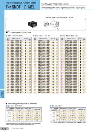 Перетачиваемые головки сверл Тип МEL для плавного резания Тип SMDT… D MEL (Низкоуглеродистая сталь, нержавеющая сталь, серый чугун) Твердый сплав с PVD покрытием: ACX80 Головка сверла (пластина) øD: 12,0~15,3 мм øD: 15,4~18,7 мм øD: 18,8~30,5 мм øD(мм) Обозначение Склад H(мм) øD(мм) Обозначение Склад H (мм) øD(мм) Обозначение Склад H(мм) 12,0 SMDT 1200 D MEL l 9,1 15,4 SMDT 1540 D MEL l 11,0 18,8 SMDT 1880 D MEL l 12,9 12,1 SMDT 1210 D MEL l 9,1 15,5 SMDT 1550 D MEL l 11,0 18,9 SMDT 1890 D MEL l 12,9 12,2 SMDT 1220 D MEL l 9,1 15,6 SMDT 1560 D MEL l 11,0 19,0 SMDT 1900 D MEL l 13,5 12,3 SMDT 1230 D MEL l 9,1 15,7 SMDT 1570 D MEL l 11,0 19,1 SMDT 1910 D MEL l 13,5 12,4 SMDT 1240 D MEL l 9,1 15,8 SMDT 1580 D MEL l 11,0 19,2 SMDT 1920 D MEL l 13,5 12,5 SMDT 1250 D MEL l 9,4 15,9 SMDT 1590 D MEL l 11,0 19,3 SMDT 1930 D MEL l 13,5 12,6 SMDT 1260 D MEL l 9,4 16,0 SMDT 1600 D MEL l 11,6 19,4 SMDT 1940 D MEL l 13,5 12,7 SMDT 1270 D MEL l 9,4 16,1 SMDT 1610 D MEL l 11,6 19,5 SMDT 1950 D MEL l 13,5 12,8 SMDT 1280 D MEL l 9,4 16,2 SMDT 1620 D MEL l 11,6 19,6 SMDT 1960 D MEL l 13,5 12,9 SMDT 1290 D MEL l 9,4 16,3 SMDT 1630 D MEL l 11,6 19,7 SMDT 1970 D MEL l 13,5 13,0 SMDT 1300 D MEL l 9,7 16,4 SMDT 1640 D MEL l 11,6 19,8 SMDT 1980 D MEL l 13,5 13,1 SMDT 1310 D MEL l 9,7 16,5 SMDT 1650 D MEL l 11,6 19,9 SMDT 1990 D MEL l 13,5 13,2 SMDT 1320 D MEL l 9,7 16,6 SMDT 1660 D MEL l 11,6 20,0 SMDT 2000 D MEL l 14,1 13,3 SMDT 1330 D MEL l 9,7 16,7 SMDT 1670 D MEL l 11,6 20,5 SMDT 2050 D MEL l 14,1 13,4 SMDT 1340 D MEL l 9,7 16,8 SMDT 1680 D MEL l 11,6 21,0 SMDT 2100 D MEL l 14,8 13,5 SMDT 1350 D MEL l 10,3 16,9 SMDT 1690 D MEL l 11,6 21,5 SMDT 2150 D MEL l 14,8 13,6 SMDT 1360 D MEL l 10,3 17,0 SMDT 1700 D MEL l 12,2 22,0 SMDT 2200 D MEL l 15,0 13,7 SMDT 1370 D MEL l 10,3 17,1 SMDT 1710 D MEL l 12,2 22,5 SMDT 2250 D MEL l 15,0 13,8 SMDT 1380 D MEL l 10,3 17,2 SMDT 1720 D MEL l 12,2 23,0 SMDT 2300 D MEL l 15,1 13,9 SMDT 1390 D MEL l 10,3 17,3 SMDT 1730 D MEL l 12,2 23,5 SMDT 2350 D MEL l 15,1 14,0 SMDT 1400 D MEL l 10,3 17,4 SMDT 1740 D MEL l 12,2 24,0 SMDT 2400 D MEL l 15,4 14,1 SMDT 1410 D MEL l 10,3 17,5 SMDT 1750 D MEL l 12,2 24,5 SMDT 2450 D MEL l 15,4 14,2 SMDT 1420 D MEL l 10,3 17,6 SMDT 1760 D MEL l 12,2 25,0 SMDT 2500 D MEL l 15,8 14,3 SMDT 1430 D MEL l 10,3 17,7 SMDT 1770 D MEL l 12,2 25,5 SMDT 2550 D MEL l 15,8 14,4 SMDT 1440 D MEL l 10,3 17,8 SMDT 1780 D MEL l 12,2 26,0 SMDT 2600 D MEL l 16,4 14,5 SMDT 1450 D MEL l 10,3 17,9 SMDT 1790 D MEL l 12,2 26,5 SMDT 2650 D MEL l 16,4 14,6 SMDT 1460 D MEL l 10,3 18,0 SMDT 1800 D MEL l 12,9 27,0 SMDT 2700 D MEL l 17,1 14,7 SMDT 1470 D MEL l 10,3 18,1 SMDT 1810 D MEL l 12,9 27,5 SMDT 2750 D MEL l 17,1 14,8 SMDT 1480 D MEL l 10,3 18,2 SMDT 1820 D MEL l 12,9 28,0 SMDT 2800 D MEL l 17,7 14,9 SMDT 1490 D MEL l 10,3 18,3 SMDT 1830 D MEL l 12,9 28,5 SMDT 2850 D MEL l 17,7 15,0 SMDT 1500 D MEL l 11,0 18,4 SMDT 1840 D MEL l 12,9 29,0 SMDT 2900 D MEL l 18,3 15,1 SMDT 1510 D MEL l 11,0 18,5 SMDT 1850 D MEL l 12,9 29,5 SMDT 2950 D MEL l 18,3 15,2 SMDT 1520 D MEL l 11,0 18,6 SMDT 1860 D MEL l 12,9 30,0 SMDT 3000 D MEL l 19,0 15,3 SMDT 1530 D MEL l 11,0 18,7 SMDT 1870 D MEL l 12,9 30,5 SMDT 3050 D MEL l 19,0 Рекомендуемые режимы резания Для сверл 3хD и 5хD Для сверл 8xD Материал Низкоуглер. сталь Нерж. сталь Материал Низкоуглер. сталь Нерж. сталь Серый чугун Серый чугун Ø сверла (мм) (~HB250) (~HB200) Ø сверла (мм) (~HB250) (~HB200) vc 80 – 100 – 120 50 – 60 – 70 50 – 80 – 90 vc 50 – 70 – 80 40 – 50 – 60 40 – 60 – 80 ~ 16,0 f 0,15 – 0,2 – 0,35 0,1 – 0,15 – 0,2 0,2 – 0,25 – 0,3 ~ 16,0 f 0,15 – 0,2 – 0,35 0,1 – 0,15 – 0,2 0,2 – 0,25 – 0,3 vc 80 – 100 – 120 50 – 60 – 70 70 – 90 – 100 vc 50 – 70 – 80 40 – 50 – 60 50 – 70 – 90 ~ 20,0 f 0,15 – 0,25 – 0,35 0,15 – 0,2 – 0,25 0,25 – 0,3 – 0,35 ~ 20,0 f 0,15 – 0,25 – 0,35 0,15 – 0,2 – 0,25 0,25 – 0,3 – 0,35 vc 80 – 110 – 130 60 – 70 – 80 80 – 100 – 110 vc 60 – 80 – 90 50 – 60 – 70 60 – 80 – 100 ~ 30,5 ~ 30,5 f 0,2 – 0,3 – 0,35 0,15 – 0,2 – 0,25 0,2 – 0,35 – 0,45 f 0,2 – 0,3 – 0,35 0,15 – 0,2 – 0,25 0,2 – 0,35 – 0,45 Примечание: Высокое качество сверления достигается при использовании (vc : Скорость резания (м/мин), f: Подача (мм/об) (мин. - стандарт. - макс.)) точного и жесткого станка и стабильного крепления заготовки. K36 l = Европейский склад Сверла MULTI DRILL