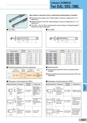 Сверла SUMIDIA Тип DAL/DDL/DML Для общего и высокоточного сверления алюминиевых сплавов! l Высокоточное сверло DAL обеспечивает точность отверстий по 7-8 квалитету. l Сверла общего типа DDL обеспечивают точность отверстий по 11-12 квалитету. l Тип DML - это тип DDL с кромкой для снятия фаски, объединяющий 2 процесса в одну операцию. Тип DAL Тип DDL СкладОбозначениеDA2200øD L l СкладОбозначениеDA2200øD L l DAL 0500H ~ 0600H ø5 ≤ D ≤ ø6 80 30 DDL 050V ~ 060V ø5 ≤ D ≤ ø6 80 30 DAL 0601H ~ 0700H ø6 < D ≤ ø7 90 35 DDL 061V ~ 070V ø6 < D ≤ ø7 90 35 DAL 0701H ~ 0800H ø7 < D ≤ ø8 90 35 DDL 071V ~ 080V ø7 < D ≤ ø8 90 35 DAL 0801H ~ 0900H ø8 < D ≤ ø9 100 40 DDL 081V ~ 090V ø8 < D ≤ ø9 100 40 DAL 0901H ~ 1000H ø9 < D ≤ ø10 100 40 DDL 091V ~ 100V ø9 < D ≤ ø10 100 40 DAL 1001H ~ 1100H ø10 < D ≤ ø11 110 50 DDL 101V ~ 110V ø10 < D ≤ ø11 110 50 DAL 1101H ~ 1200H ø11 < D ≤ ø12 110 50 DDL 111V ~ 120V ø11 < D ≤ ø12 110 50 Рекомендуемые режимы резания Примечание: Скорость Подача Глубинарезания (м/мин)(мм/об)сверления L/DСОЖl Используйте жесткие станки и высокоточныеоправки. øD < 8 0,05 ~ 0,2 Водо- l Используйте достаточное количество СОЖ для 80 ~ 250 Менее 3 х D растворимая сверления. 8 ≤ øD 0,1 ~ 0,3 СОЖ Примеры спользования (DAL) Примеры использования (DDL) Форма отверстия Материал Режимырезания Результаты Форма отверстия Материал Режимырезания Результаты •ТвердоплавноеА390сверло просверлило2000 отверстийАлюминий свысокимVc=100 м/мин• Сверло SumiDiaпросверлило 30000f=0,1 мм/оботверстийсодержанием•Стойкость в 15 разкремниявыше, чем утвердосплавныхАК12М2Алюминиевоелитье подVc=214 м/мин• Переточка последавлениемf=0,14 мм/об100000 отверстийОтверстие подрезьбу M8 сверл А390Алюминий • В среднем- 40000с высокимотверстийсодержаниемкремнияVc=120 м/минf=0,12 мм/об•Шероховатостьповерхности Ry=(отверстие ø101 мкм• Переточка послеАК12М274000 отверстийАлюминиевоеVc=200 м/мин(2000 м)литье подf=0,17 мм/об(регламентиро-давлениемванная заменаинструмента) в отливке) АК12 • Переточка после Алюминиевоелитье подVc=90 м/минf=0,08 мм/обдавлением• Более 50000отверстий AK5M4 80000 отверстийАлюминиевоеVc=234 м/минf=0,28 мм/об(регламентиро-литьеванная замена инструмента) K47 MULTI DRILL Сверла