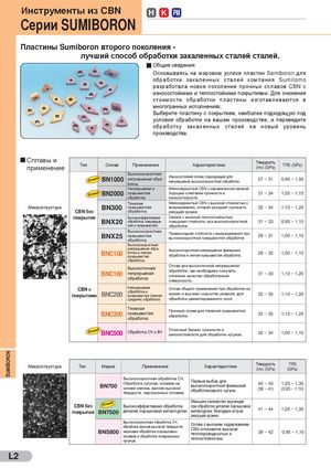Инструменты из CBN H K PM Серии SUMIBORON Пластины Sumiboron второго поколения - лучший способ обработки закаленных сталей сталей. - Общие сведения Основываясь на мировом успехе пластин Semiboron для обработки закаленных сталей компания Sumitomo разработала новое поколение прочных сплавов CBN с износостойкими и теплостойкими покрытиями. Для снижения стоимости обработки пластины изготавливаются в многогранных исполнениях. Выберите пластину с покрытием, наиболее подходящую под условия обработки на вашем производстве, и переведите обработку закаленных сталей на новый уровень производства. - Сплавы иприменение Тип Сплав Применение Характеристики Твердость(Hv) (GPa)TRS (GPa) ВысокоскоростнаяНовый BN1000непрерывная обра-ботка.Износостойкий сплав, подходящий длянепрерывной высокоскоростной обработки.27 ~ 310,90 ~ 1,00 Непрерывная и Мелкозернистый CBN с керамической связкой. Новый BN2000 прерывистая Хорошее сочетание прочности и 31 ~ 34 1,05 ~ 1,15 обработка износостойкости. Тяжелая Мелкозернистый CBN с высокой стойкостью к Микроструктура BN300 прерывистая выкрашиванию, которая улучшает прочность 32 ~ 34 1,10 ~ 1,20 CBN без обработка режущей кромки. покрытия Высокоэффективная Связка с высокой теплостойкостью BNX20 обработка (непрерыв- повышает стойкость при высокоскоростной 31 ~ 33 0,95 ~ 1,10 ная и прерывистая) обработке ВысокоскоростнаяBNX25прерывистаяобработка Превосходная стойкость к выкрашиванию привысокоскоростной прерывистой обработке29 ~ 311,00 ~ 1,10 Высокоскоростная непрерывная обра-BNC100ботка и легкаяпрерывистаяВысокоскоростная непрерывная финишнаяобработка и легкая прерывистая обработка.29 ~ 321,00 ~ 1,10 обработка. ВысокоточнаяBNC160непрерывнаяобработка Сплав для высокоточной непрерывнойобработки, где необходимо получитьотличное качество обработаннойповерхности.31 ~ 331,10 ~ 1,20 CBN спокрытиемBNC200 Непрерывнаяобработка ипрерывистая (легкая- Сплав общего применения при обработке нанизких и высоких скоростях резания, для33 ~ 351,10 ~ 1,20 средняя) обработка обработки цементированного слоя. ТяжелаяBNC300прерывистаяобработка Прочный сплав для тяжелой прерывистойобработки. 33 ~ 35 1,15 ~ 1,25 Новый BNC500 Обработка СЧ и ВЧ Отличный баланс прочности иизносостойкости для обработки чугунов.32 ~ 341,00 ~ 1,10 Микроструктура Тип Марка Применение Характеристики Твердость TRS(Hv) (GPa)(GPa) BN700 Высокоскоростная обработка СЧ,Обработка чугунов, сплавов наоснове железа, валков высокойтвердости, жаропрочных сплавов.Первый выбор длявысокоскоростной финишнойобработкисерого чугуна.40 ~ 431,20 ~ 1,30(38 ~ 41)(0,95 ~ 1,10) CBN без Новый Меньшее количество заусенцевВысокоэффективная обработкапри обработке деталей порошковойпокрытияBN7500деталей порошковой металлургии.металлургии, благодаря острой41 ~ 441,25 ~ 1,35 режущей кромке. Высокоскоростная обработка СЧ,обрабока валков высокой твердости,BNS800черновая обработка порошковыхсплавов и обработка специальныхчугунов.Сплав с высоким содержаниемCBN отличается высокойтеплопроводностью итеплостойкостью.39 ~ 420,95 ~ 1,10 L2 SUMIBORON