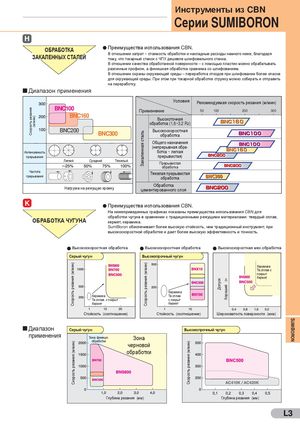 Скорость резания (м/мин) Скорость резания (м/мин)Скорость резания (м/мин) Закаленная сталь Скорость резания (м/мин) Скорость резания (м/мин) Допуск Хороший Инструменты из CBN Серии SUMIBORON H ОБРАБОТКА Преимущества использования CBN. В отношении затрат – стоимость обработки и накладные расходы намного ниже, благодаря ЗАКАЛЕННЫХ СТАЛЕЙ тому, что токарный станок с ЧПУ дешевле шлифовального станка. В отношении качества обработанной поверхности – с помощью пластин можно обрабатывать различные профили, а финишная обработка сравнима со шлифованием. В отношении охраны окружающей среды – переработка отходов при шлифовании более опасна для окружающей среды. При этом при токарной обработке стружку можно собирать и отправить на переработку. - Диапазон применения Условия Рекомендуемая скорость резания (м/мин) BNC100 Применение 50 100 200 300 BNC160 l l l l l l Высокоточная обработка (1,6~3,2 Rz) BNC200 BNC300 Высокоскоростнаяобработка Общего назначения (непрерывная обра- Интенсивность ботка ~ легкая прерывания прерывистая) Легкий Средний Тяжелый Прерывистая обработка Частотапрерывания Тяжелая прерывистаяобработка Нагрузка на режущую кромку Обработкацементированного слоя K Преимущества использования CBN. На нижеприведенных графиках показаны преимущества использования CBN для обработки чугуна в сравнении с традиционными режущими материалами: твердый сплав, ОБРАБОТКА ЧУГУНА кермет, керамика. SumlBoron обеспечивает более высокую стойкость, чем традиционный инструмент, при высокоскоростной обработке и дает более высокую эффективность и точность. Высокоскоростная обработка Высокоскоростная обработка Высокоскоростная мех.обработка Серый чугун Высокопрочный чугун Керамика Тв.сплав с покрыт. Кермет Керамика Керамика Тв.сплав Тв.сплав. с покрыт с покрыт Кермет Кермет Стойкость (соотношение) Стойкость (соотношение) Шероховатость поверхности (мкм) - Диапазон Серый чугун Высокопрочный чугун применения Зона финишн. Зона обработки черновой обработки Глубина резания (мм) Глубина резания (мм) L3 a SUMIBORON