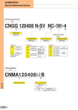 SUMIBORON Система обозначения пластин Неперетачиваемый тип CNGG 120408 N-SV NC-(W)-4 Пластина Код ISO С зачистн. кромкой Wiper Стружколом Неперетачиваемый тип К-во реж. кромок Таблица 2* Таблица 3 Таблица 4 Таблица 2* Таблица 3 Таблица 4 Код Описание Код Неперетачиваемыйтип Сплав Код К-во реж. кромок Тип – Стандартныйтип NC SUMIBORON BNC80, 150С покрытиемBNC200, 300–1 реж. кромка Одногранные22 реж. кромки SV Тип состружколомом BNX10, 20NUBN250, 300SUMIBORONBN500, 70033 реж. кромки Много-44 реж. кромкигранные *) Дополнительная Без покрытияинформацияNS BNX25 6 6 реж. кромок Перетачиваемый тип CNMA120408(-) B ISO код пластины Доп. информация Таблица 1 Таблица 1, Код Описание (–) B Верх пластины из CBN L4 SUMIBORON
