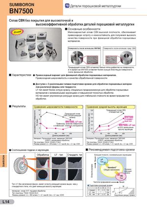 SUMIBORON PM Детали порошковой металлургии BN7500 Сплав CBN без покрытия для высокоточной и высокоэффективной обработки деталей порошковой металлургии - Основные особенности Новый Мелкозернистый сплав CBN высокой плотности, обеспечивает превосходную остроту и износостойкость для получения высокого качества поверхности при финишной обработке порошковых материалов. Поверхность после использов. BN7500 Поверхность после использов. пред. CBN Предыдущий сплав CBN оставляет белые пятна дефектов на поверхности, в то время как BN7500 оставляет более лучшую блестящую поверхность после финишной обработки. - Характеристики l Превосходный вариант для финишной обработки порошковых материалов. Превосходная шероховатость и качество обработанной поверхности. l Доступен с 3 различными типами подготовки кромки для обработки порошковых материа- лов различной формы или твердости. LF-тип имеет более острую кромку, специально предназначенную для обработки порошковых материалов с минимальными заусенцами и повышенной точностью обработки. HS-тип имеет упрочненную режущую кромку для стабильной стойкости во время прерывистой обработки. - Результаты Сравнение шероховатости поверхности Сравнение средней высоты заусенцев Предыдущий сплав CBN (стандартный тип) Предыдущий сплав CBN (острая режущая кромка) BN7500 Стандарт- BN7500, LF тип ный тип Превосход. качество поверхностии стабильнаястойкость инструмента BN7500, LF тип на 50% уменьшение высоты заусенцев Длина резания (км) Длина резания (км) Материал: Порошковый сплав, эквивалент SMF4040 Материал: Порошковый сплав, эквивалент SMF4040 (HRB70, непрерывная обработка) (HRB70, непрерывная обработка) Тип пластины: CNGA 120408 LF-NU2 Тип пластины: CNGA 120408 LF-NU2 Режимы резания: vc = 200 м/мин, f = 0,1 мм/об, doc = 0,1 мм, СОЖ Режимы резания: vc = 200 м/мин, f = 0,1 мм/об, doc = 0,1 мм, СОЖ Соотношение подачи и заусенцев - Рекомендуемая подготовка кромки Обработка LF - тип Стандартн. тип Большая точность с минимальными заусенцами LF Тип ”Standard ” (Общее назначение) Прочная режущая кромка HS Тип Частота прерывания Выше Тип LF, без негативной фаски, имеет остроту режущей кромки выше, чем у стандартного типа, что дает меньшую высоту заусенцев. Подготовка режущей кромки α w r Материал: сплав VVT, торцевая обработка Стандарт 15° 0,12 Нет Тип пластины: TNGA 160404 NU3 LF - тип – – Нет Режимы резания: vc = 200 м/мин, f = 0,1 мм/об, doc = 0,1 мм, СОЖ HS - тип 35° 0,12 Да Скругление режущ. кромки L14 SUMIBORON Шероховатость поверхности Rz (мкм) Высота заусенца (мм) Острота кромки Выше