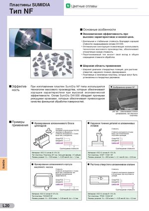 Пластины SUMIDIA N Цветные сплавы Тип NF - Основные особенности Экономическая эффективность при высоких характеристиках и низкой цене. • Длительная и стабильная стойкость благодаря хорошей стойкости к выкрашиванию сплава DA1000. • Оптимальная конструкция позволяющая использовать технологии массового производства, обеспечивает относительно низкую стоимость. • Перетачиваемый тип вносит свой вклад в общее сокращение стоимости обработки. Широкая область применения • Широкий диапазон стандартных позиций, для расточки отверстий, наружного точения, фрезерования. • Позитивные и негативные пластины, которые могут быть установлены в стандартных державках. - Эффектив- При изготовлении пластин SumiDia NF-типа используются l Изображение кромки NF ность технологии массового производства, которые обеспечивают хорошие характеристики при высокой экономической эффективности. Сплав SumiDia DA1000 обладает прочными режущими кромками, которые обеспечивает превосходное качество финишной обработки поверхностей. (NF-тип – обеспечивает точное шлифование, как обычные пластины - Примеры Фрезерование алюминиевого блока Наружное точение деталей из алюминиевых применения цилиндров сплавов Стойкость: Стойкость: Благодаря остроте кромки DA2200, заусенцы не образуются. Стойкость инструмента в 6 раза Стойкость инструмента в 1,5 раза выше, при относительном выше чем у конкурентов. отсутствии заусенцев. Сплав PCD Сплав PCD конкурента конкурента SUMIDIA NF SUMIDIA NF 1 2 1 6 Соотношение стойкости Соотношение стойкости Материал: ADC12 (сплав Al-12% Si) Материал: ADC12 (сплав Al-12% Si) Тип пластины: Пластины 20° поз. типа для фрезер. (12 зубьев) Тип пластины: VCMT 110301 NF Режимы резания: Vc = 1000 м/мин, f = 0,025 мм/об, doc = 1,2 мм Режимы резания: Vc = 800 м/мин, f = 0,1 мм/об, doc = 0,02 мм Фрезерование алюминиевого корпуса Расточка отверстия в алюминиевом клапане масляного насоса Стойкость: Стойкость: Стойкость инструмента в 1,5 раза выше чем у конкурентов, при Стойкость инструмента примерно большей экономической в 50 раз выше, при отсутствии за- эффективности. усенцев. Сплав PCD Сплав PCD конкурента конкурента SUMIDIA NF SUMIDIA NF 1 2 1 50 Соотношение стойкости Соотношение стойкости Материал: ADC12 (сплав Al-12% Si) Материал: ADC12 (сплав Al-12% Si) Тип пластины: TEEN32R NF Тип пластины: TPGN 110304 NF Режимы резания: Vc = 3000 м/мин, f = 0,06 мм/об, doc = 0,2 мм Режимы резания: Vc = 530 м/мин, f = 0,05 мм/об, doc = 0,2 мм L20 SUMIDIA