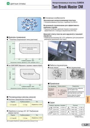Подача (мм/об)Подача (мм/об) N Цветные сплавы Неперетачиваемые пластины SUMIDIA Тип Break Master DM - Основные особенности Экономичная неперетачиваемая пластина. • Неперетачиваемые пластины, подобные SumiBoron Встроенный стружколомом для эффективного удаления стружки • Решение проблемы удаления стружки и улучшения эффективности с помощью стружколома DM-типа. Широкий спектр пластин для наружной и торцевой обработки - Диапазон применения • Ромбические пластины 80° и 55° добавлены для расширения Пластины треугольного типа (расточка) диапазона применений этой серии. Диапазон эффективной работы стружколома Глубина резания (мм) (Внутреннее точение, обработка с СОЖ, материал: ADC12 Тип CCMT/DCMT (Наружная и торцевая токарная обраб.) - Работа стружколома Break Master Без стружколома Диапазон эффективной работы стружколома - Применение Глубина резания (мм) Тип обработки Режимы резания Результаты (Внутреннее точение, обработка с СОЖ, материал: ADC12 Материал:AC2A-T6 Финишная расточка отверстияVc=300 м/миндает Ra менее 1мкм. f =0,06 мм/об Стружка формуется отдельными Операция: doc =0,35 мм завитками длиной около 2мм. - Рекомендуемые режимы резания Внутр. рас- СОЖточка Внутри отверстия стружкапрактически не остается. Расточка (треугольные пластины) Подача Глубина резания Тип - Серии ~ 0,15 мм/об. ~ 0,7 мм Обработка с СОЖ Токарная: наружная и торцевая Расточка CCMT 0602_ _ L/R-DM NU TPMT 0802_ _ L/R-DM NU CCMT 09T3_ _ L/R-DM NU TPMT 0902_ _ L/R-DM NU Обработка по контуру (55°, 80° Ромбическая DCMT 0702_ _ L/R-DM NU TPMR 1103_ _ L/R-DM NU *( ) форма пластин DCMT 11T3_ _ L/R-DM NU TPMR 1603_ _ L/R-DM NU *( ) Подача Глубина резания Тип (*) Склад в Японии Поставка по запросу ~ 0,15 мм/об. ~ 0,5 мм Обработка с СОЖ Для торцевой обработки, глубина должна быть меньше 0,4 мм L21 SUMIDIA