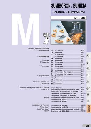 SUMIBORON / SUMIDIA Пластины и инструменты M M1 ~ M34 Пластины SUMIBORON /SUMIDIA C / 80° ромбические CC_ _ 7° позитивые ............................................... M2-3 CN_ _ негативные ................................................. M4-5 CP_ _ 11° позитивые .............................................. M5 D / 55° ромбические DC_ _ 7° позитивые ............................................... M6-7 DN_ _ негативные ................................................. M8 R / Круглые RN_ _ негативные ................................................. M9 S / Квадратные SC_ _ 7° позитивые ................................................ M9 SN_ _ негативные ................................................. M10-11 T / Треугольные TB_ _ 5° позитивые ................................................ M11 TC_ _ 7° позитивые ................................................ M12 TN_ _ негативные ................................................. M13 TP_ _ 11° позитивые (без отверстия) .................... M14 TP_ _ 11° позитивые (без отверстия) .................... M15 V / 35° ромбические VB_ _ 5° позитивые ............................................... M16 VC_ _ 7° позитивые ............................................... M16 VN_ _ негативные ................................................. M17 W / Ломанный треугольник WN_ _ негативные ................................................ M18 Специальные ZNEX негативные .................................................. M18 Прецизионный инструмент SUMIBORON / SUMIDIA Общие сведения .................................................... M19 SUMIBORON Расточные резцы для малых диаметров, тип BNBB .... M20 Расточные резцы для малых диаметров, тип BNZ /BNB .......... M21 Державки для точения канавок, тип GWB .......... M22-23 Державки для нарезки резьбы, тип BNGG ......... M24 SUMIDIA Расточные резцы для малых диаметров, тип DABB..... M25 Торцовая фреза, тип RF......................................... M26 Торцовая фреза, тип SRF ...................................... M27 SUMIBORON ”BN Finish Mill” Торцовая фреза, тип FMU...................................... M28-29 ”Helical Master” Концевая фреза, тип BNES ................................... M30 ”Mould Finish Master” Мелкоразмерные сферические фрезы, тип BNBP .. M31 SUMIDIA Сверла, тип DAL / DDL / DML ................................ M32-33 M1 Инструмент Sumiboron / SumiDia