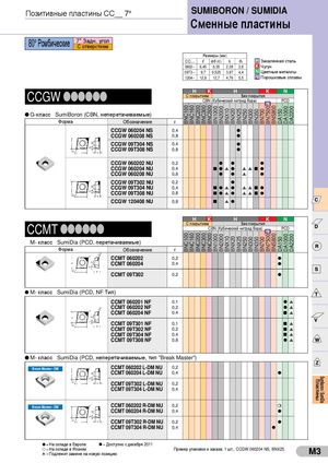 BNC100BNC100 BNC160BNC160 BNC200BNC200 BNC300BNC300 BNC500BNC500 BN1000BN1000 BN2000BN2000 BNX10BNX10 BNX20BNX20 BNX25BNX25 BN250BN250 BN300BN300 BN350BN350 BN700BN700 BN7500BN7500 BNS800BNS800 DA150DA150 DA1000DA1000 DA2200DA2200 Позитивные пластины СС__ 7° SUMIBORON / SUMIDIA Сменные пластины 80° Ромбические 7° Задн. уголС отверстием Размеры (мм) CC– – l ød (IC) s d1 H Закаленная сталь 0602-- 6,45 6,35 2,38 2,8 K Чугун 09T3 -- 9,7 9,525 3,97 4,4 N Цветные металлы 1204-- 12,9 12,7 4,76 5,5 PM Порошковые сплавы CCGW llllll H K H K NС покрытиемБез покрытияCBN (Кубический нитрид бора)PMPCD G-класс SumiBoron (CBN, неперетачиваемые) Форма Обозначение r CCGW 060204 NS 0,4 l CCGW 060208 NS 0,8 l CCGW 09T304 NS 0,4 l CCGW 09T308 NS 0,8 l CCGW 060202 NU 0,2 l l l CCGW 060204 NU 0,4 n l s l s s n l CCGW 060208 NU 0,8 l l s l CCGW 09T302 NU 0,2 l CCGW 09T304 NU 0,4 n l s l s s n l CCGW 09T308 NU 0,8 n l s l s s n l CCGW 120408 NU 0,8 n s l H K H K N CCMT llllll С покрытием Без покрытияCBN C(КBуNби(чКеусбкиичйеснкиитйриндитброирда)бора)PMPCD M- класс SumiDia (PCD, перетачиваемые) Форма Обозначение r CCMT 060202 0,2 l CCMT 060204 0,4 l CCMT 09T302 0,2 l M- класс SumiDia (PCD, NF Тип) CCMT 060201 NF 0,1 l s CCMT 060202 NF 0,2 l s CCMT 060204 NF 0,4 n s CCMT 09T301 NF 0,1 n s CCMT 09T302 NF 0,2 n s CCMT 09T304 NF 0,4 n s CCMT 09T308 NF 0,8 l s M- класс SumiDia (PCD, неперетачиваемые, тип ”Break Master”) Break Master- DM CCMT 060202 L-DM NU 0,2 CCMT 060204 L-DM NU 0,4 l CCMT 09T302 L-DM NU 0,2 CCMT 09T304 L-DM NU 0,4 Break Master- DM CCMT 060202 R-DM NU 0,2 m CCMT 060204 R-DM NU 0,4 l CCMT 09T302 R-DM NU 0,2 l CCMT 09T304 R-DM NU 0,4 l l = На складе в Европе n = Доступно с декабря 2011 l = На складе в Японииs = Подлежит замене на новую позицию Пример упаковки и заказа; 1 шт., CCGW 060204 NS, BNX25 M3 Пластины Sumiboron / SumiDia