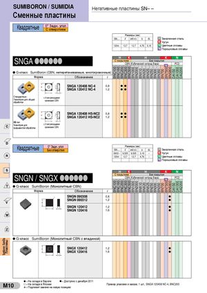 Sumiboron / SumiDia Пластины BNC100BNC100 BNC160BNC160 BNC200BNC200 BNC300BNC300 BNC500BNC500 BN1000BN1000 BN2000BN2000 BNX10BNX10 BNX20BNX20 BNX25BNX25 BN250BN250 BN300BN300 BN350BN350 BN700BN700 BN7500BN7500 BNS800BNS800 DA150DA150 DA1000DA1000 DA2200DA2200 SUMIBORON / SUMIDIA Негативные пластины SN– – Сменные пластины Квадратные 0° Задн. уголС отверстием Размеры (мм) SN– – l ød (IC) s d1 H Закаленная сталь K Чугун 1204-- 12,7 12,7 4,76 5,16 N Цветные сплавы PM Порошковые сплавы SNGA llllll H K H K NС покрытиемБез покрытияCBN (Кубический нитрид бора)PMPCD G-класс SumiBoron (CBN, неперетачиваемые, многокромочные) Форма Обозначение r SNGA 120408 NC-4 0,8 l l SNGA 120412 NC-4 1,2 l l Стандартные - с 4-мя режущими Геометрия для общей кромками CBN обработки SNGA 120408 HS-NC2 0,8 l l SNGA 120412 HS-NC2 1,2 l l HS-тип Геометрия для с 2-мя режущими прерывистой обработки кромками CBN Квадратные 0° Задн. уголБез отверстия Размеры (мм)SN– –lød (IC) s d1 H Закаленная сталь 0903 -- 9,525 9,525 3,18 – K Чугун 1204-- 12,7 12,7 4,76 – N Цветные сплавы PM Порошковые сплавы H K H K N SNGN / SNGX llllll С покрытием Без покрытияCBN (Кубический нитрид бора) PCDPM G-класс SumiBoron (Монолитный CBN) Форма Обозначение r SNGN 090308 0,8 l SNGN 090312 1,2 l SNGN 120412 1,2 l SNGN 120416 1,6 l G-класс SumiBoron (Монолитный CBN с впадиной) SNGX 120412 1,2 l SNGX 120416 1,6 l l = На складе в Европе n = Доступно с декабря 2011 M10 l = На складе в Японииs = Подлежит замене на новую позицию Пример упаковки и заказа; 1 шт., SNGA 120408 NC-4, BNC200