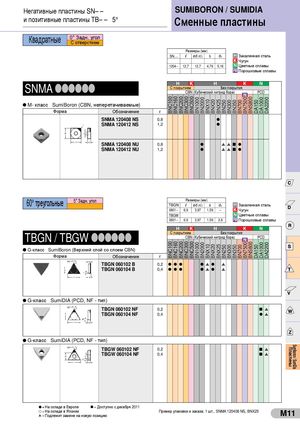 BNC100BNC100 BNC160BNC160 BNC200BNC200 BNC300BNC300 BNC500BNC500 BN1000BN1000 BN2000BN2000 BNX10BNX10 BNX20BNX20 BNX25BNX25 BN250BN250 BN300BN300 BN350BN350 BN700BN700 BN7500BN7500 BNS800BNS800 DA150DA150 DA1000DA1000 DA2200DA2200 Негативные пластины SN– – SUMIBORON / SUMIDIA и позитивные пластины TB– – 5° Сменные пластины Квадратные 0° Задн. уголС отверстием Размеры (мм) SN– – l ød (IC) s d1 H Закаленная сталь K Чугун 1204-- 12,7 12,7 4,76 5,16 N Цветные сплавы PM Порошковые сплавы SNMA llllll H K H K NС покрытиемБез покрытияCBN (Кубический нитрид бора)PMPCD M- класс SumiBoron (CBN, неперетачиваемые) Форма Обозначение r SNMA 120408 NS 0,8 l SNMA 120412 NS 1,2 l SNMA 120408 NU 0,8 l s s n l SNMA 120412 NU 1,2 l s s n l 60° треугольные 5° Задн. угол Размеры (мм)TBGNlød (IC) s d1 H Закаленная сталь 0601-- 6,9 3,97 1,59 – K Чугун TBGW N Цветные сплавы 0601-- 6,9 3,97 1,59 2,8 PM Порошковые сплавы H K H K N TBGN / TBGW llllll С покрытием Без покрытияCBN (Кубический нитрид бора) PCDPM G-класс SumiBoron (Верхний слой со слоем CBN) Форма Обозначение r TBGN 060102 B 0,2 l l l l s l s TBGN 060104 B 0,4 l l l l s l s G-класс SumiDIA (PCD, NF - тип) TBGN 060102 NF 0,2 n s TBGN 060104 NF 0,4 l s G-класс SumiDIA (PCD, NF - тип) TBGW 060102 NF 0,2 n s TBGW 060104 NF 0,4 n s l = На складе в Европе n = Доступно с декабря 2011 l = На складе в Японииs = Подлежит замене на новую позицию Пример упаковки и заказа; 1 шт., SNMA 120408 NS, BNX25 M11 Пластины Sumiboron / SumiDia