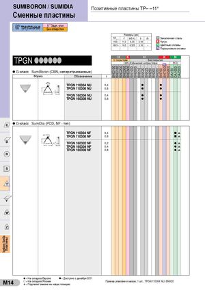 Sumiboron / SumiDia Пластины BNC100 BNC160 BNC200 BNC300 BNC500 BN1000 BN2000 BNX10 BNX20 BNX25 BN250 BN300 BN350 BN700 BN7500 BNS800 DA150 DA1000 DA2200 SUMIBORON / SUMIDIA Позитивные пластины TP– –11° Сменные пластины 60° треугольные 11° Задн. уголБез отверстия Размеры (мм) TP– – l ød (IC) s d1 H Закаленная сталь 1103-- 11,0 6,35 3,18 – K Чугун 1603-- 16,5 9,525 3,18 – N Цветные сплавы PM Порошковые сплавы TPGN llllll H K H K NС покрытиемБез покрытияCBN (Кубический нитрид бора)PMPCD G-класс SumiBoron (CBN, неперетачиваемые) Форма Обозначение r TPGN 110304 NU 0,4 l l TPGN 110308 NU 0,8 l l TPGN 160304 NU 0,4 l l TPGN 160308 NU 0,8 l l G-класс SumiDia (PCD, NF - тип) TPGN 110304 NF 0,4 n s TPGN 110308 NF 0,8 n s TPGN 160302 NF 0,2 l s TPGN 160304 NF 0,4 l s TPGN 160308 NF 0,8 l s l = На складе в Европе n = Доступно с декабря 2011 M14 l = На складе в Японииs = Подлежит замене на новую позицию Пример упаковки и заказа; 1 шт., TPGN 110304 NU, BNX20