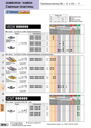 Sumiboron / SumiDia Пластины BNC100BNC100 BNC160BNC160 BNC200BNC200 BNC300BNC300 BNC500BNC500 BN1000BN1000 BN2000BN2000 BNX10BNX10 BNX20BNX20 BNX25BNX25 BN250BN250 BN300BN300 BN350BN350 BN700BN700 BN7500BN7500 BNS800BNS800 DA150DA150 DA1000DA1000 DA2200DA2200 SUMIBORON / SUMIDIA Позитивные пластины VB– – 5° и VC– – 7° Сменные пластины 35° Ромбические 5° & 7° Задн. уголС отверстием Размеры (мм) VB– – l ød (IC) s d1 H Закаленная сталь 1102- - 11,0 6,35 2,38 2,81103 - -3,18 K ЧугунN Цветные сплавы 1604 - - 16,6 9,525 4,76 4,4 PM Порошковые сплавы VBGW llllll H K H K NС покрытиемБез покрытияCBN (Кубический нитрид бора)PMPCD G-класс SumiBoron (CBN, неперетачиваемые) Форма Обозначение r VBGW 110202 NC 0,2 l VBGW 110204 NC 0,4 l Стандартные - VBGW 110208 NC 0,8 l Геометрия для общей обработки VBGW 110202 NU 0,2 l VBGW 110204 NU 0,4 l l VBGW 110208 NU 0,8 l VBGW 160402 NU 0,2 l VBGW 160404 NU 0,4 n l s l s l s n VBGW 160408 NU 0,8 n l s l s l s n G-класс SumiBoron (CBN, неперетачиваемые, многокромочные) VBGW 160404 NC-2 0,4 l l l l VBGW 160408 NC-2 0,8 l l l l Стандартные -Геометрия для общейс 2-мя режущими обработки кромками CBN VBGW 160404 LS-NC2 0,4 l l l VBGW 160408 LS-NC2 0,8 l l l LS - тип Геометрия для чистовой с 2-мя режущими обработки кромками CBN VBGW 160404 HS-NC2 0,4 l l HS-тип VBGW 160408 HS-NC2 0,8 l l Геометрия для с 2-мя режущими прерывистой обработки кромками CBN VBGW 160404 NU-2 0,4 n l s l s VBGW 160408 NU-2 0,8 n l s l s с 2-мя режущими кромками CBN H K H K N VCMT llllll С покрытием Без покрытияCBN (Кубический нитрид бора) PCDPM M- класс SumiDia (PCD, NF - тип) Форма Обозначение r VCMT 110301 NF 0,1 l s VCMT 110302 NF 0,2 l s VCMT 110304 NF 0,4 l s VCMT 160404 NF 0,4 n s VCMT 160408 NF 0,8 n s VCMT 160412 NF 1,2 l s l = На складе в Европе n = Доступно с декабря 2011 M16 l = На складе в Японииs = Подлежит замене на новую позицию Пример упаковки и заказа; 1 шт., VBGW 110202 NC, BNC200