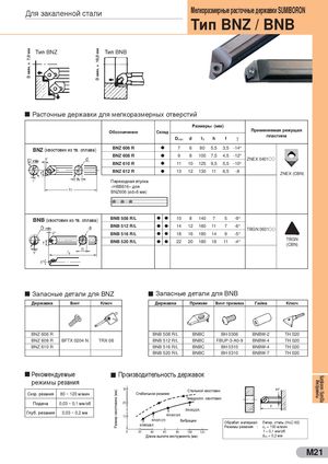 7,0 ммD мин. = 10,0 ммD мин. = Размер хвостовика (мм) Для закаленной стали Мелкоразмерные расточные державки SUMIBORON Тип BNZ / BNB Тип BNZ Тип BNB Расточные державки для мелкоразмерных отверстий Размеры (мм) Обозначение Склад Применяемая режущая Dmin d 1l h f γ пластина BNZ (хвостовик из тв. сплава) BNZ 606 R l 7 6 80 5,5 3,5 -14° BNZ 608 R l 9 8 100 7,5 4,5 -12° ZNEX 0401l l BNZ 610 R l 11 10 125 9,5 5,5 -10° BNZ 612 R l 13 12 130 11 6,5 -8 ZNEX (CBN) Переходная втулка «HBB616» для BNZ606 (ød=6 мм) BNB (хвостовик из тв. сплава) BNB 508 R/L l l 10 8 140 7 5 -9° BNB 512 R/L l l 14 12 160 11 7 -6° TBGN 0601l l BNB 516 R/L l l 18 16 180 14 9 -5° BNB 520 R/L l l 22 20 180 18 11 -4° TBGN(CBN) Запасные детали для BNZ Запасные детали для BNB Державка Винт Ключ Державка Прижим Винт прижима Гайка Ключ BNZ 606 R BNB 508 R/L BNBC BH 0306 BNBW-2 TH 020 BNZ 608 R BFTX 0204 N TRX 06 BNB 512 R/L BNBC FBUP-3-A0-9 BNBW-4 TH 020 BNZ 610 R BNB 516 R/L BNBC BH 0310 BNBW-4 TH 020 BNB 520 R/L BNBC BH 0310 BNBW-7 TH 020 Рекомендуемые Производительность державок режимы резания Стальной хвостовик Скор. резания 80 ~ 120 м/мин Стабильное резание Твердоспл. хвостовик Подача 0,03 ~ 0,1 мм/об Глуб. резания 0,03 ~ 0,2 мм Вибрации Обрабат. материал: Легир. сталь (HRC 60) Режимы резания : vc = 100 м/мин f = 0,1 мм/об Длина вылета инструмента (мм) doc = 0,2 мм M21 Инструменты Sumiboron / SumiDia