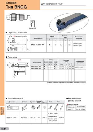 SUMIBORON Для закаленной стали Тип BNGG Державки "Sumiboron" Нарезание резьбы Обозначение Склад Размеры(мм) Применяемыепластины R L f l2 l1 BNTT 1020 R/L BNGG R/L 2525 -TT l m 28,5 5 150 BNTT 1530 R/L Пластины BNTT Склад Размеры Обозначение BN250 BN300 BNX20 (мм) Применяемыедержавка R L R L R L Pitch r l1 s BNTT 1020 R/L l m l m 1,0 ~ 2,0 0,13 25 6,0 BNGG R/L 2525 -TT BNTT 1530 R/L l m l m 1,5 ~ 3,0 0,13 25 6,0 • Данные режущие пластины подходят и для державок BNG2525R Запасные детали Рекомендуемые Державка Суппорт Прижим Регулир.винтПружина Винт Ключ режимы резания Нарезка резьбы Скоростьрезания (vc)80 ~ 120 м/мин Подача ( f ) Макс. шаг: 3,0 мм BX 0615 LH050 (для фиксатора ) BNGG R/L 2525 - TT BNGS R/L TT BNGC R/L FM J GSP 6 ø1,8x45 BX 0414 LH03 для суппорта M24 Sumiboron / SumiDia Инструменты