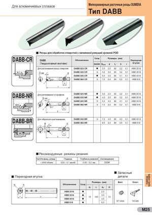 Для алюминиевых сплавов Мелкоразмерные расточные резцы SUMIDIA Тип DABB Резцы для обработки отверстий с напаянной режущей кромкой POD DABB-CR DABB Склад Размеры (мм)ОбозначениеПерходная (Твердосплавный хвостовик) DA2200 Dмин d l1 h r втулка Для растачивания малых отверстий DABB 025 CR l 3,0 2,5 60 2,2 0,1 HBB 2516 DABB 035 CR m 4,0 3,5 60 3,2 0,1 HBB 3516 DABB 045 CR l 5,0 4,5 80 4,1 0,1 HBB 4516 DABB 060 CR m 7,0 6,0 80 5,2 0,1 HBB 616 DABB-NR Для растачивания по профилю DABB 025 NRDABB 035 NR l 3,0 2,5 60 2,2 0,1 HBB 2516l4,03,5603,20,1HBB 3516 DABB 045 NR m 5,0 4,5 80 4,1 0,1 HBB 4516 DABB 060 NR m 7,0 6,0 80 5,2 0,1 HBB 616 DABB-BR Для обратного растачивания DABB 045 BRDABB 060 BR m 7,0 4,5 80 4,0 0,1 HBB 45169,06,0805,50,1HBB 616 Рекомендуемые режимы резания Частота вращ. шпинд. Подача Глубина резания Охлаждение > 2000 об/мин 0,03 ~ 0,1 мм/об 0,03 ~ 0,2 мм СОЖ Запасные Переходная втулка детали Размеры (мм) Винт Ключ Обозначение Склад d1 L d2 H HBB 2516 l 2,5 HBB 3516 l 3,5 16 100 15 HBB 4516 l 4,5 HBB 616 l BT 0404 TH 0206,0 M25 Инструменты Sumiboron / SumiDia