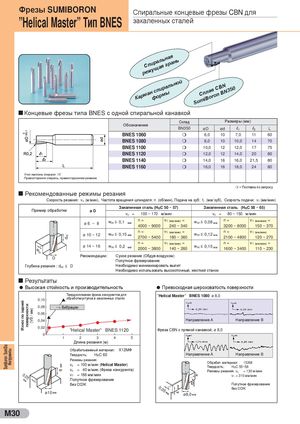 Фрезы SUMIBORON Спиральные концевые фрезы CBN для ”Helical Master” Тип BNES закаленных сталей рСепжиурщааляьнгаряань Карманфсопримраыльной SuСmпiBлаoвroCnBBNN350 Концевые фрезы типа BNES с одной спиральной канавкой Склад Размеры (мм) Обозначение BN350 øD ød l1 l2 L BNES 1060 m 6,0 10 7,0 11 60 BNES 1080 m 8,0 10 10,0 14 70 BNES 1100 m 10,0 12 12,0 17 75 BNES 1120 m 12,0 12 14,0 20 80 BNES 1140 m 14,0 16 16,0 21,5 80 BNES 1160 m 16,0 16 18,0 24 80 Угол наклона спирали: 15˚ Правостороння спираль, правосторроннее резание m = Поставка по запросу Рекомендованные режимы резания Скорость резания: vc (м/мин), Частота вращения шпинделя: n (об/мин), Подача на зуб: ft (мм/ зуб), Скорость подачи: v f (мм/мин) Пример обработки øD Закаленная сталь (HRC 50 ~ 57) Закаленная сталь (HRC 58 ~ 65) vc = 100 ~ 170 м/мин vc = 80 ~ 150 м/мин ø6 ~ 8 woc ≤ 0,1 мм n= vf (мм/мин) = woc ≤ 0,08 мм n= vf (мм/мин) =4000 ~ 9000240 ~ 5403200 ~ 8000150 ~ 370 ø 10 ~ 12 woc ≤ 0,15 мм n= vf (мм/мин) =2700 ~ 5400180 ~ 360woc ≤0,12 ммn= vf (мм/мин)2100 ~ 4800120 ~ 270 w ø 14 ~ 16 woc ≤ 0,2 мм n= vf (мм/мин) =2000 ~ 3800140 ~ 260woc ≤0,15 ммn= vf (мм/мин) =1600 ~ 3400110 ~ 230 oc D Рекомендации: Сухое резание (Обдув воздухом)Попутное фрезерование Глубина резания : doc ≤ D Необходимо минимизировать вылет Необходимо использовать высокоточный, жесткий станок Результаты l Высокая стойкость и производительность l Превосходная шероховатость поверхности Твердосплавная фреза конкурентов для ”Helical Master ” BNES 1080 ø 8,0 0,10 - обработкиуступов в закаленных сталях 0,08 - --> Вибрации 0,06 - 0,04 - Направление A Направление B 0,02 - ”Helical Master” BNES 1120 Фреза CBN с прямой канавкой, ø 8,0 0- l l l l l 1 2 3 4 5 Длина резания (м) Обрабатываемый материал: Х12МФ Твердость: HRC 60 Направление A Направление B Режимы резания: vc = 100 м/мин (Helical Master)vc=40 м/мин (Фреза конкурента) Обрабат. материал: 15ХМТвердость:HRC 55~58Режимы резания: vc= 130 м/мин 0м,м05 vf = 186 мм/минПопутное фрезерование vf = 310 мм/мин без СОЖø10 мм Попутное фрезерование0,05 ммø8,0 ммбез СОЖ M30 Sumiboron / SumiDia Инструменты Износ по задней поверхности (VB / мм) мм8 doc мм4