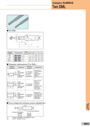 Сверла SUMIDIA Тип DML Тип DML Размеррезьбы СкладОбозначениеDA2200øDødL l1 l2 M6 DML 050V 5 8 90 18 36 M8 DML 068V 6,8 10 104 24 48 M10 DML 085V 8,5 12 122 30 60 M12 DML 103V 10,3 14 136 36 72 Примеры применения (Тип DML) Формаотверстия Материал Режимырезания Результаты • Переточка после 17 АЛ34Алюминиевоелитье.Отверстие подрезьбу M6Vc=100м/мин150 000 отверстий.• Стойкостьf=0,1мм/обтвердосплавногоОЦ с 6-юсверла 5 000шпинделямиотверстий.• Стойкость выше в 50 раз • Более 100 000 АК5М4 отверстий Алюминиевоелитье.Отверстие подVc=210м/минf=0,15мм/об(2 000 м) допереточки• Одновременное 19 резьюу М8 сверление и снятие фаски 23 АЛ34Алюминиевоелитье.Отверстие подрезьбу М10• Более 80 000отверстий (1 840Vc=250м/минм) до переточкиf=0,2мм/об• Одновременноесверление иснятие фаски Типы отверстий которые можно обработать б) Ступенчатое отверстие а) Отверстие с фаской (1) Точность размера L в пределах 0,2 мм. (2) Угол 0° меньше 180 гр. M33 +0,153 -0,083+0,112-0,153+0,112-0,153 Инструменты Sumiboron / SumiDia